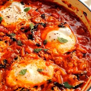 Aheartybreakfastdishofpoachedeggsinaspicy tomatosauce,oftenaccompaniedbycrustybreadfor dipping.