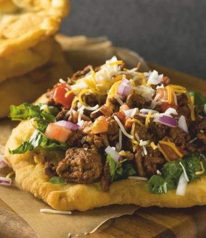 Indian Tacos - The taco with a twist. Instead of traditional shell or tortilla, Indian tacos are served on fry bread and use bison meat.
