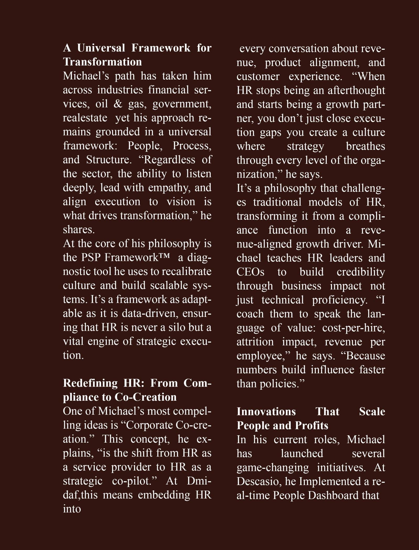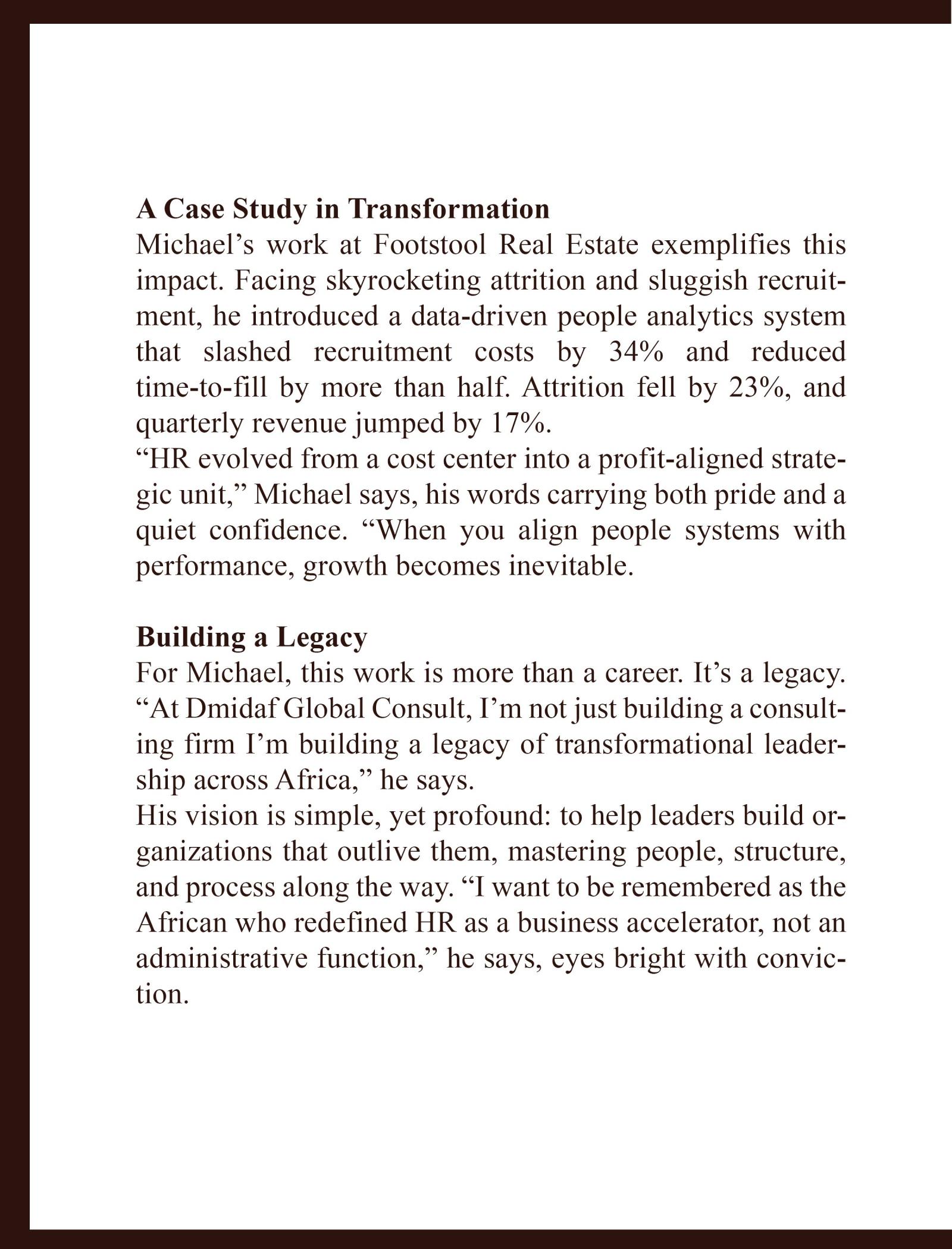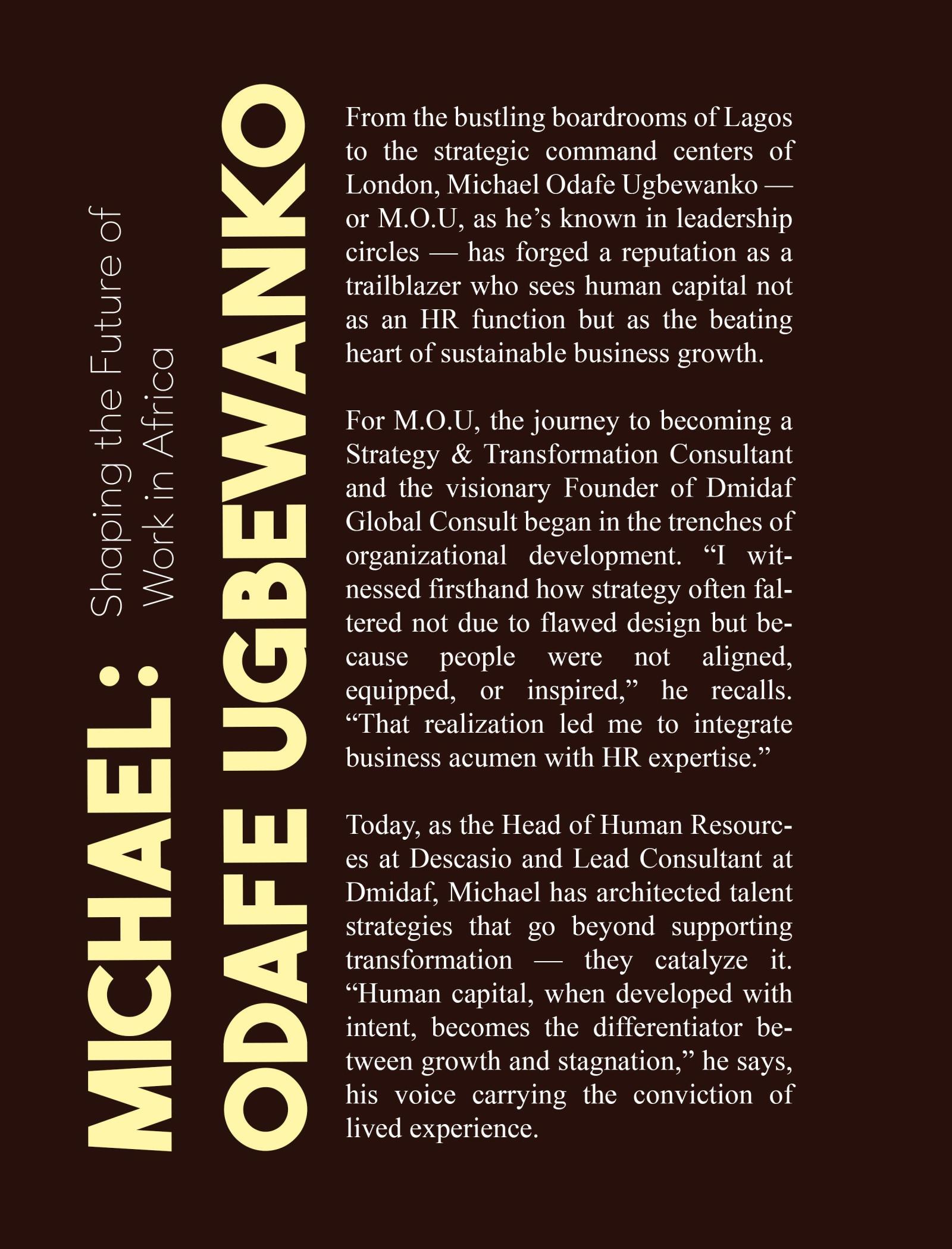 Welcome to The 10 Most Inuential HR Leaders to Follow in 2025. This edition highlights trailblazers shaping the future of people and leadership. Our cover story features Odafe Michaal Ugbewanko, an HR and leadership expert whose vision, integrity, and dedication are redening workplace excellence. Each leader featured here exemplies the power of purpose-driven leadership creating impact, building cultures, and inspiring change.
