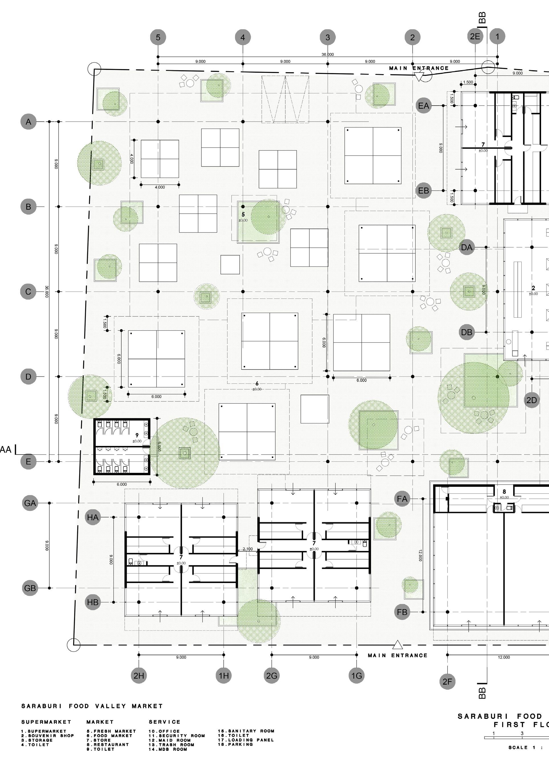 This market project, located in Saraburi, is designed to blend seamlessly with its surrounding context by avoiding high-rise buildings. The concept of “exploding mass” is applied to create dynamic spatial variations and encourage fluid movement throughout the site. This approach not only enhances circulation but also introduces a unique spatial experience within the market. Additionally, green spaces are integrated into the areas between buildings, fostering a more sustainable and inviting environment. By prioritizing accessibility, social interaction, and environmental harmony, this project redefines the traditional market as a vibrant, community-driven space.