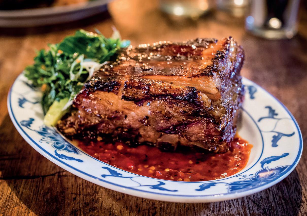 The flavours are sharply contrasted but excellently executed -particularly the crispy pork belly with pickled watermelon and picanha beef with lemongrass and chilli. The star of the show is the restaurant's namesake, a smoked goat shoulder with Thai herbs. Order it with sticky rice that you prize from a plastic bag with pink strips of goat which are fatty and tender.