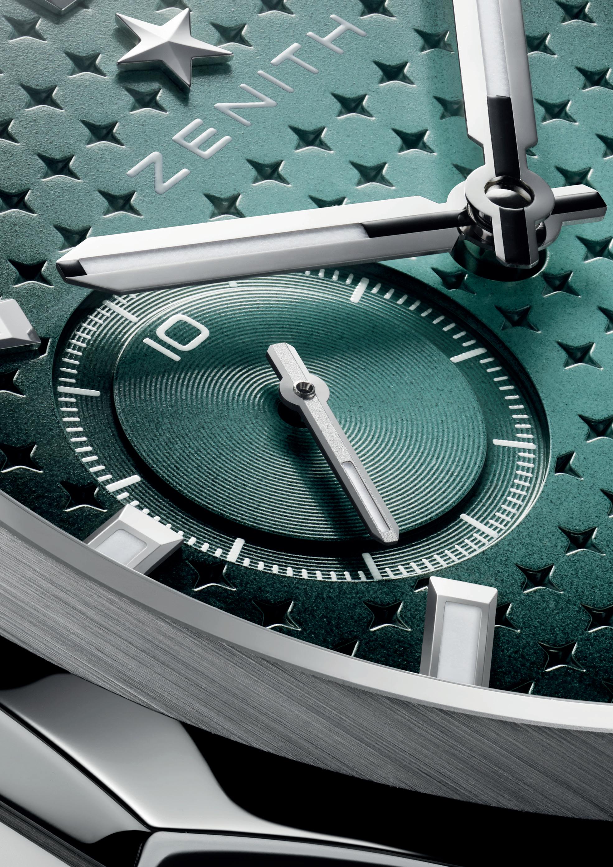 Édition Paris dial pays homage to Zenith’s tradition of innovative colour application, a hallmark first demonstrated in the 1970s with models such as the A3642, A3690, and A3691. These early DEFY watches were renowned for their pioneering use of gradient effects, which Zenith now reintroduces in a modern context with this Parisian edition. The geometric dial, adorned with Zenith’s signature Starry Sky pattern, further enhances the depth and allure of the verdigris hue.