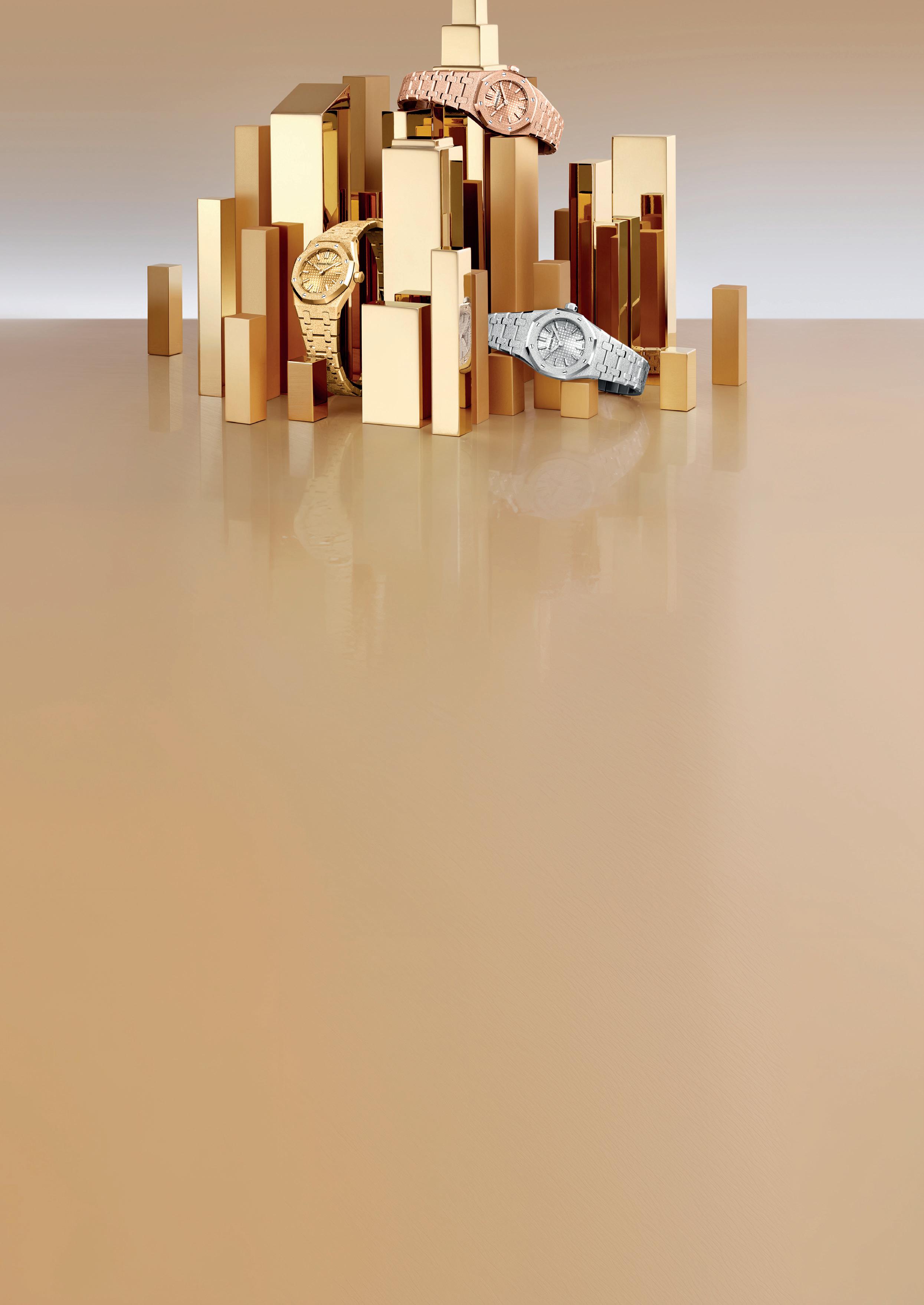 The Royal Oak Mini features a sophisticated play of light with its polished bevels, satin finishes, and intricate Frosted Gold texture.