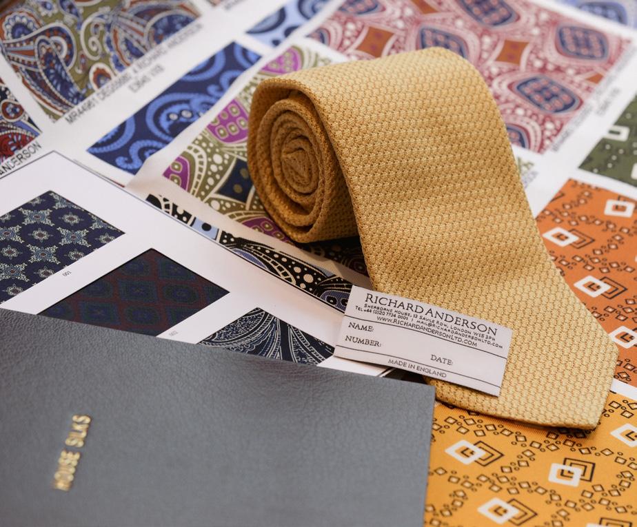 Savile Row's first bespoke tie service allows complete personalisation from silk selection to blade width. Each three-fold tie receives handfinishing in England with handwritten label bearing client's name and creation date. The houndstooth wool tie offers immediate availability in sophisticated autumn tones.