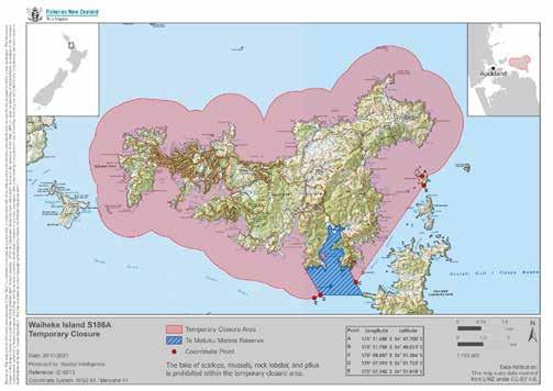 more than 15 years ago and are still in force. One of the more interesting aspects of this latest proposal is that the impact of closure will fall directly and only on recreational fisherfolk and in particular on the land-based harvesters. Across the water, and still in the Hauraki Gulf, the Waiheke Island scallop, mussel, rock lobster and pāua fisheries will close for a period of 2 years from 1 December. The temporary closure includes inshore waters around Waiheke Island out to a distance of 1 nautical mile o shore, and applies to customary, commercial, and recreational fishing.