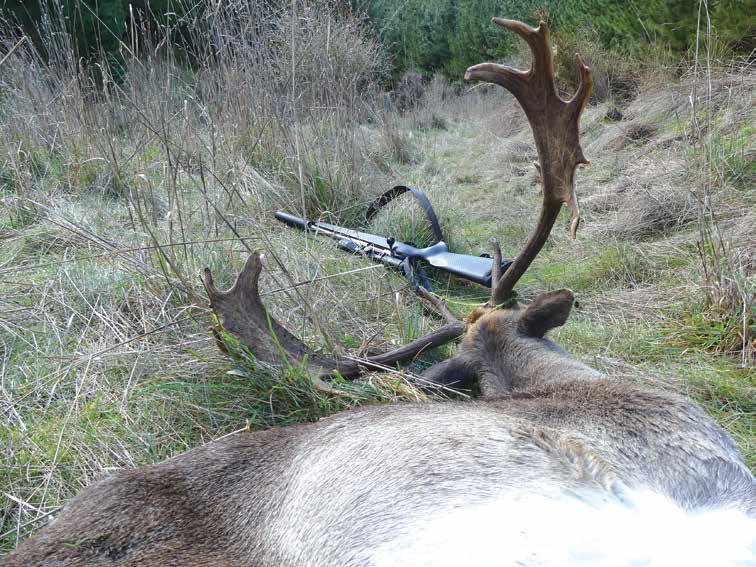 A shoulder becomes visible, semi-obscured by rushes. This will have to su ce - at any moment the breeze may swirl, or the little deer might raise his head and see me – I must trust my rifle to deliver its tiny projectile through the rushes and into the buck’s chest cavity. I pick a precise spot on the dull brown coat and ease the trigger backwards. My quarry falls, head tipped out of sight and brightly striped tail flashing back and forward. I watch from afar, rifle ready if need be. I respect the buck’s right to die quickly and in peace, I will not gloat over him in these, his final conscious seconds. Besides, I’m almost afraid to get a second look