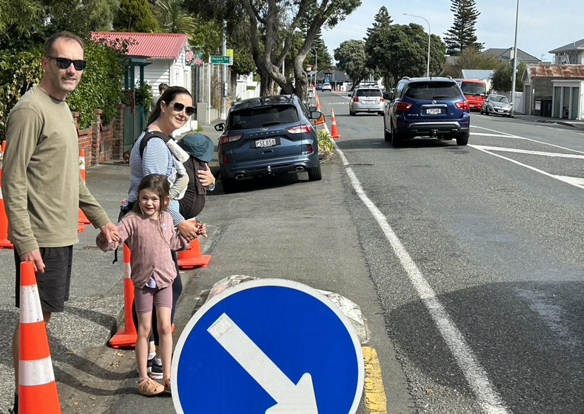in February. She said crossing the main road to get to kindy was dangerous for parents and caregivers with small children. Above, four-year-old Emily Abbott waits with her parents Nick and Sarah and baby brother Ethan, for a gap in the traffic to walk across Muritai Road.