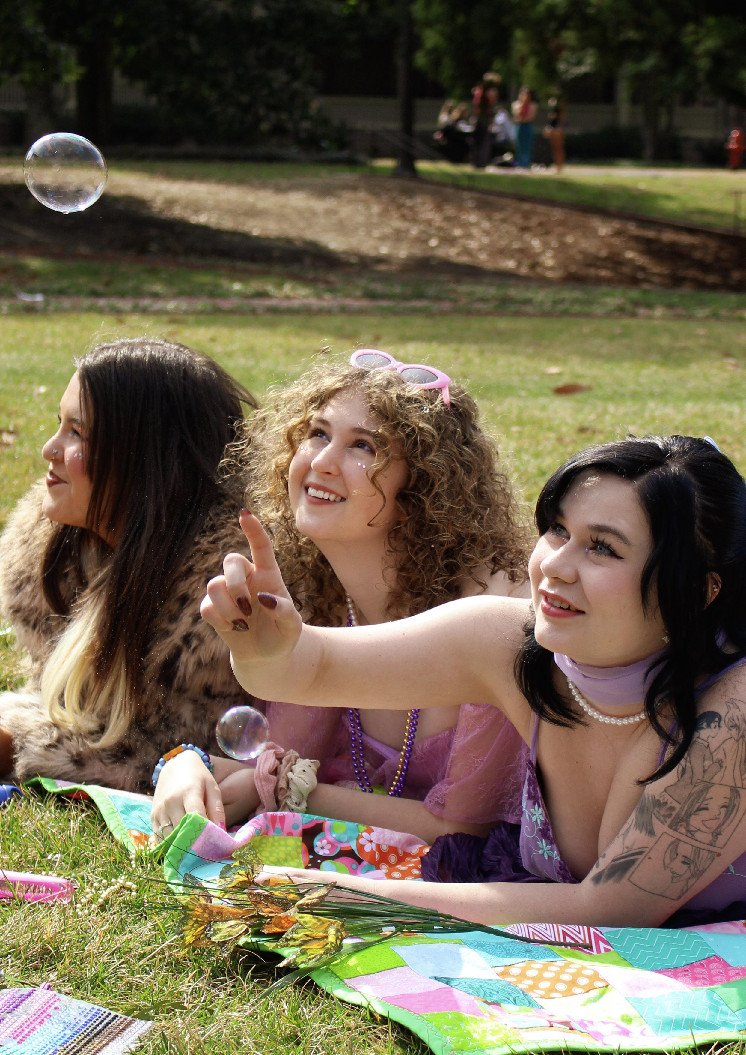 Through our photoshoots, we seek to use core childhood memories to convey lessons about how to live our lives to the fullest. “Once Upon a Time” emphasizes the value of imagination and highlights the magic that exists all around us, even if we don’t always see it. “Flat Hat Magazine’s Gone Fancy” embraces individuality through the use of bold outfits and colorful props. Lastly, “Recess” reminds us to take a break and let ourselves feel free to explore the world around us.