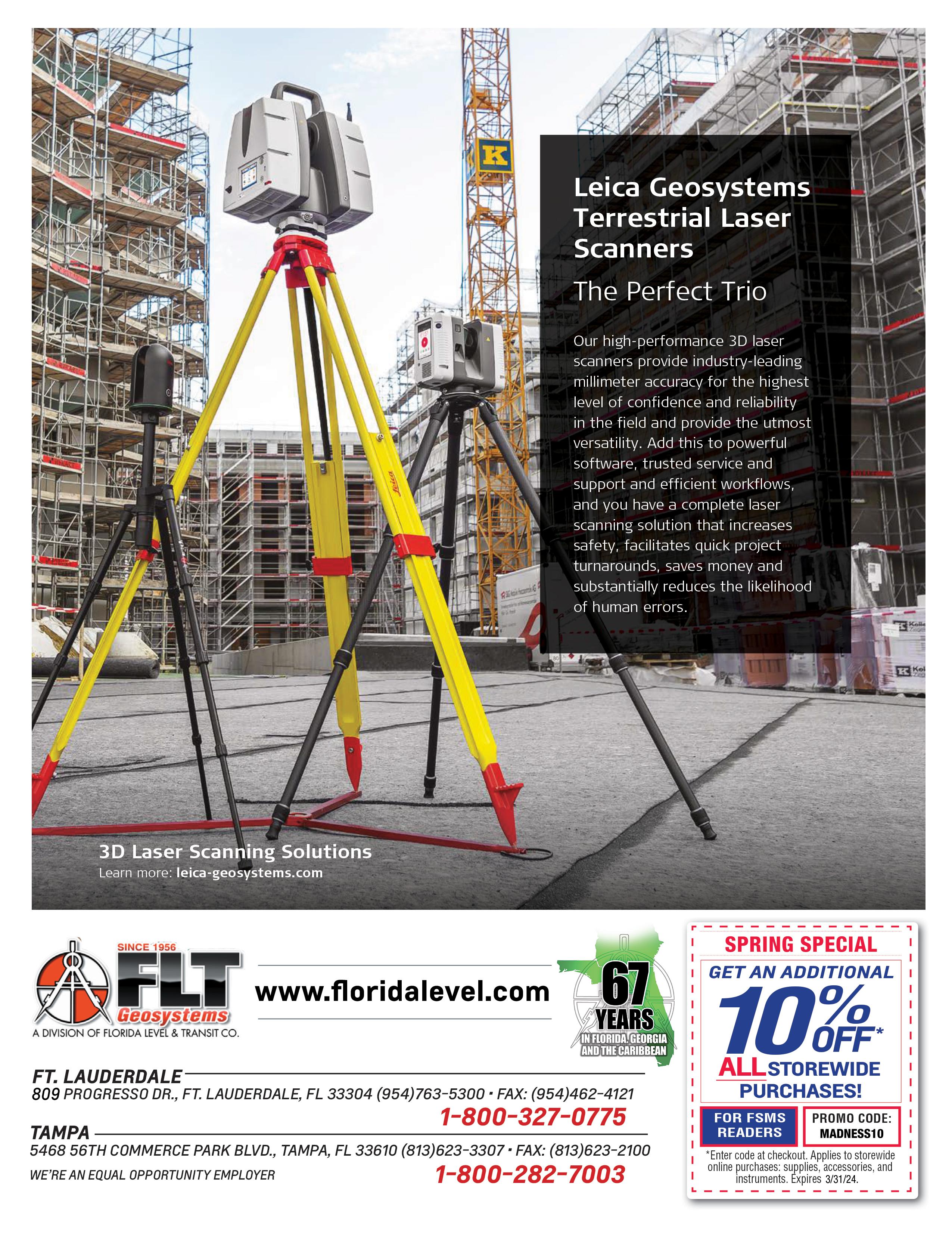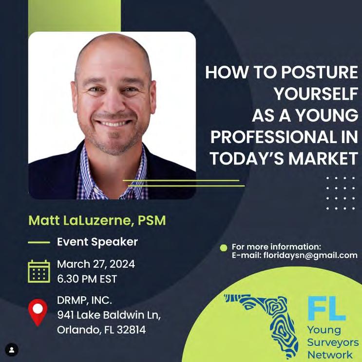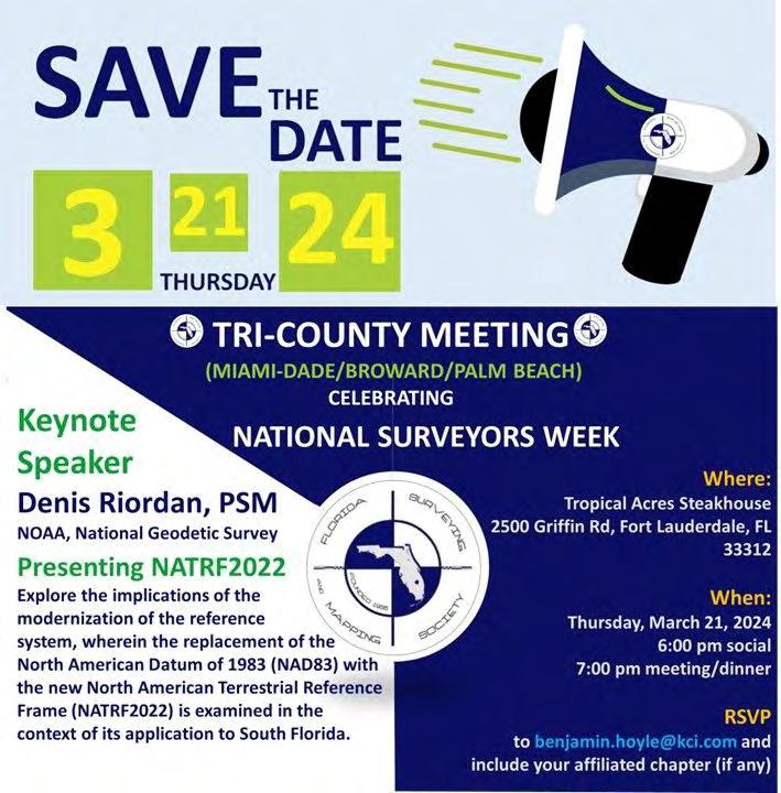 March also marks a special occasion for our profession as we celebrate National Surveyor’s Week from March 17th to March 23rd, culminating in Global Surveyors' Day on March 21st. These observances provide us with an opportunity to reflect on the importance of our work and the invaluable contributions of surveyors worldwide. Email your proclamations to communications@fsms.org for them to be featured in The Florida Surveyor.