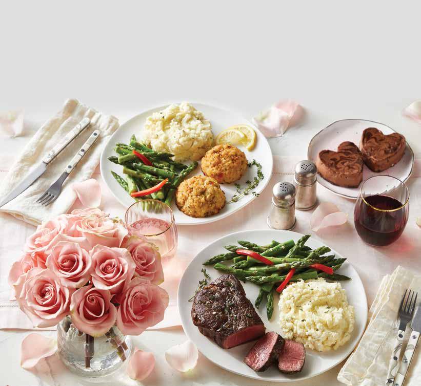 Set the mood with our Valentine’s Meal for two, thoughtfully curated for both land and sea lovers. For a more personalized approach—or a chic Galentine’s celebration— explore enticing á la carte options like our heart-shaped crab cakes and ribeyes, designed to delight. Browse our selection of vibrant bouquets, gourmet chocolates, decadent desserts and wines to make your celebration even more special. ready to cook VALENTINE ' S MEAL