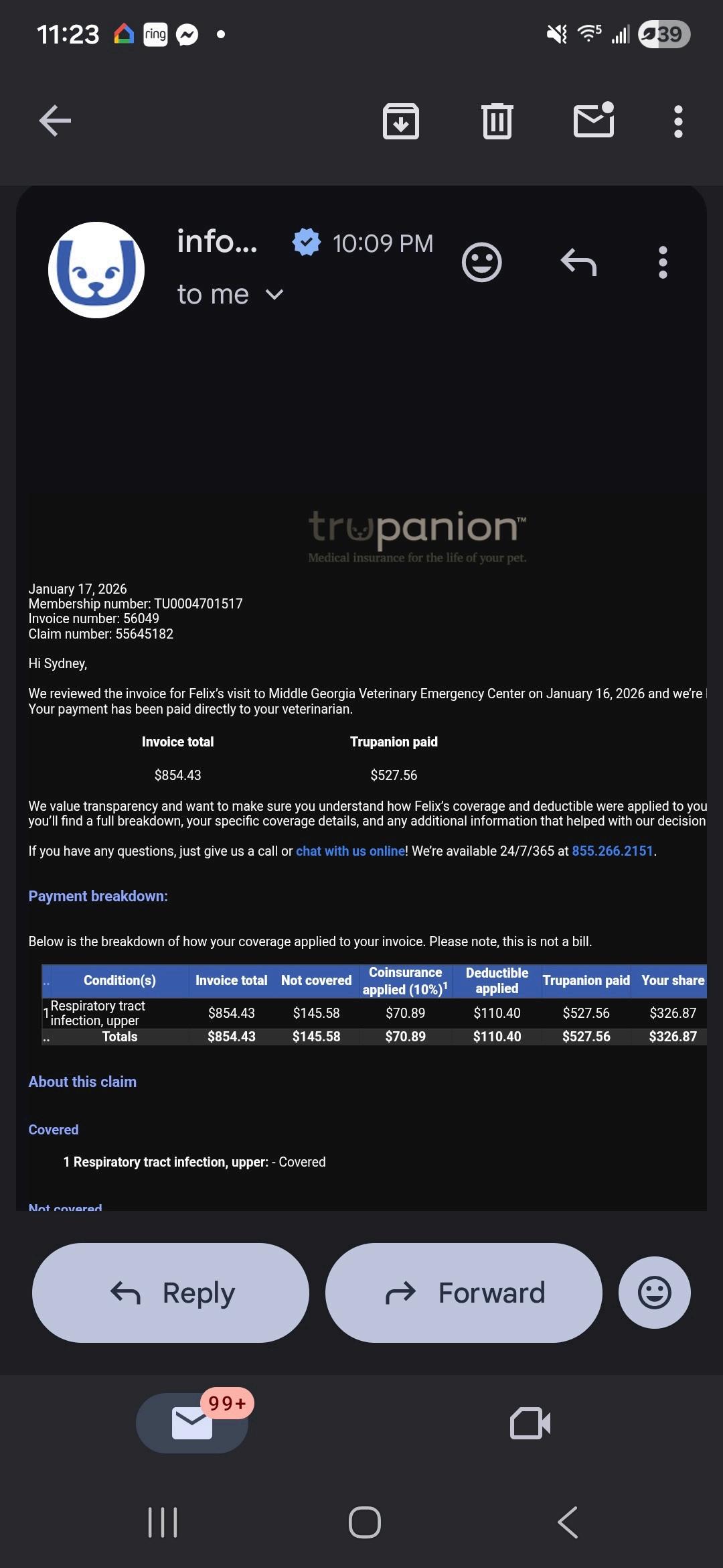 firsthand A recent emergency visit for my cat totaled $854.43. Because I had pet insurance, $527.56 was covered, leaving me to pay $376 out of pocket far more affordable than the full $854 43