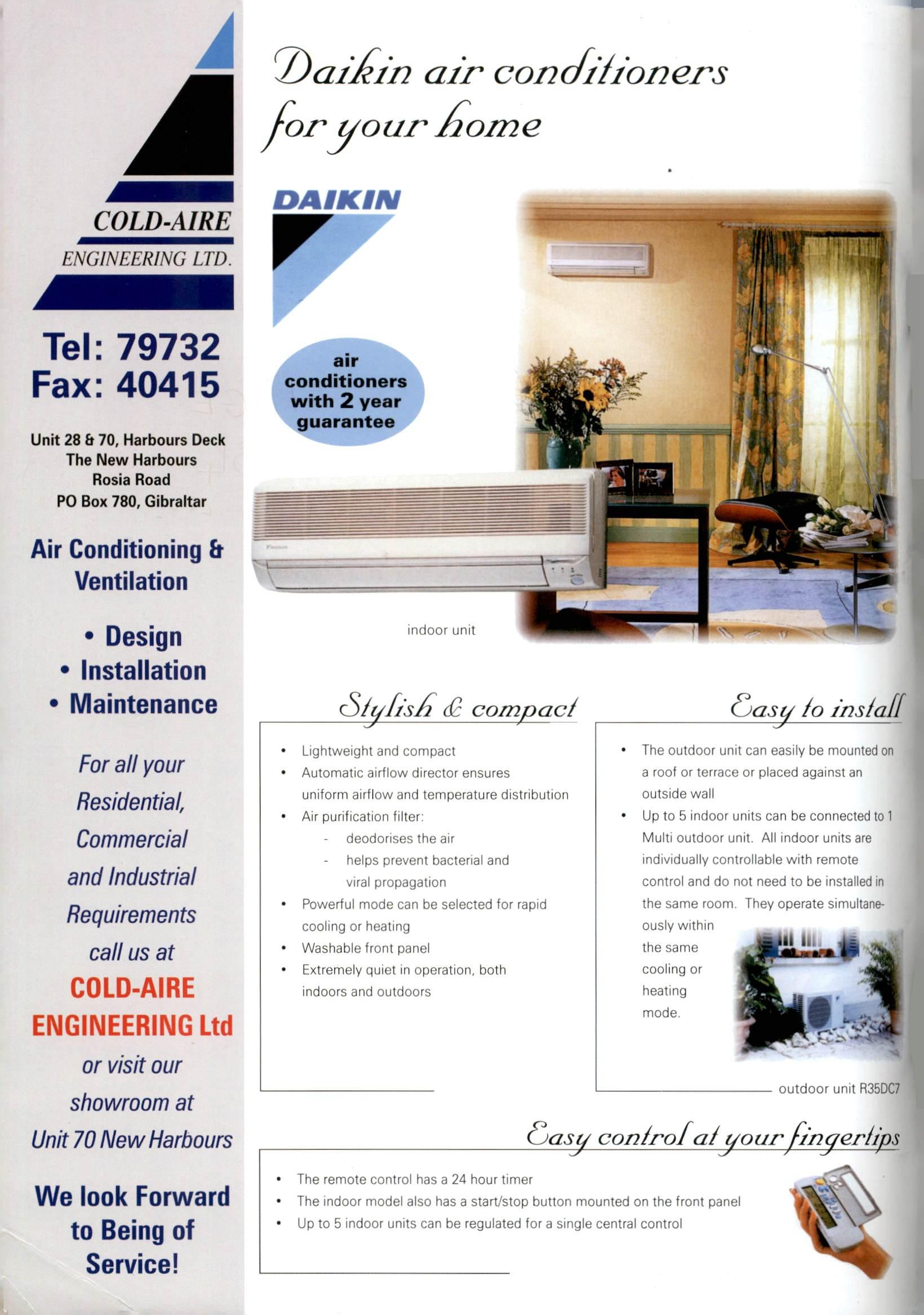 COLD-AIRE ENGINEERING LTD. Tel: 79732 Fax: 40415 Unit 28 & 70, Harbours Deck The New Harbours Rosia Road PO Box 780, Gibraltar Air Conditioning & Ventilation • Design • Installation • Maintenance