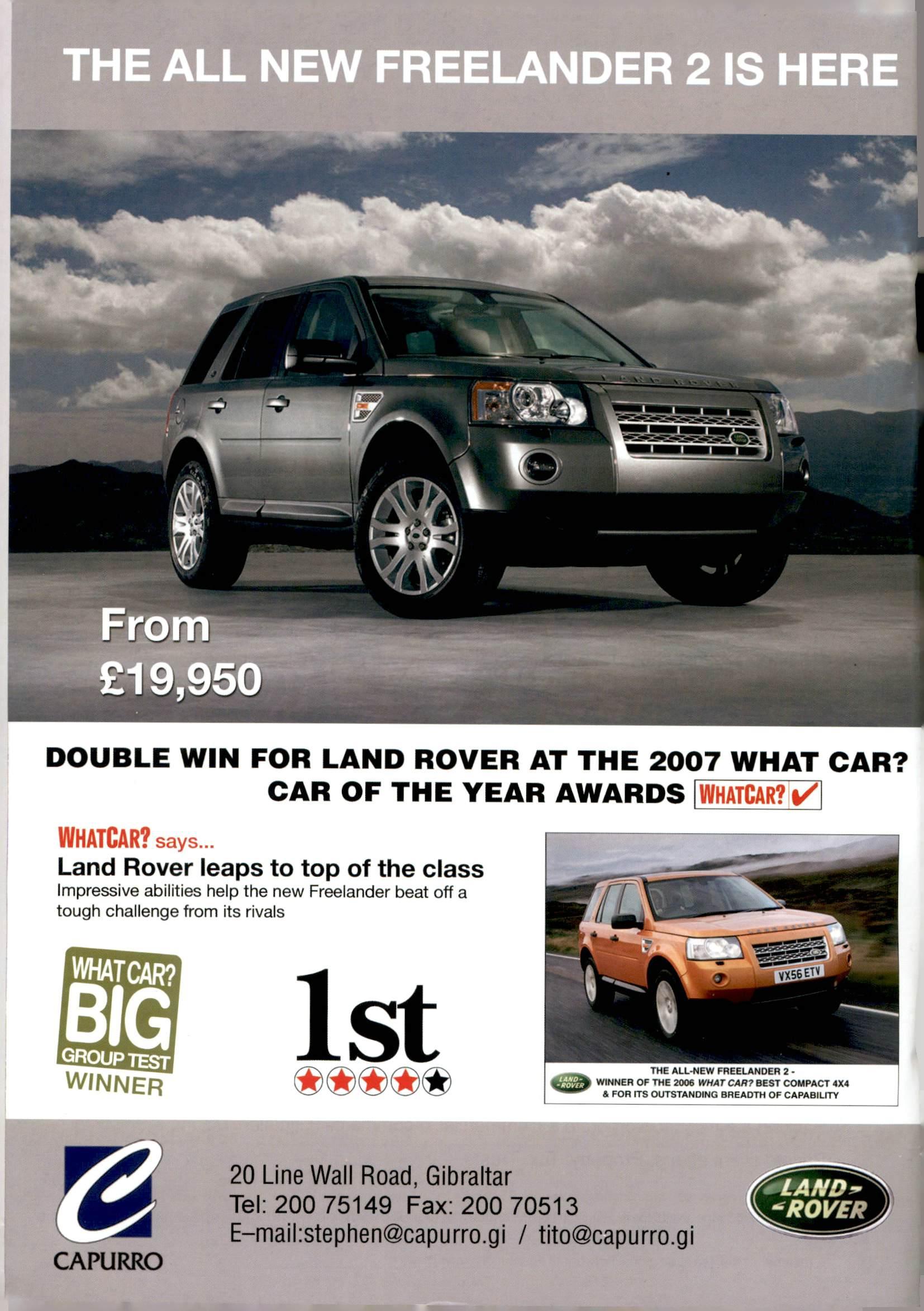 THE ALL NEW FREELANDER 2 IS HERE From £19,950 k DOUBLE WIN FOR LAND ROVER AT THE 2007 WHAT CAR? CAR OF THE YEAR AWARDS|WHATCAR?i/ WHATCAR? says... Land Rover leaps to top of the class Impressive abilities help the new Freelander beat off a tough challenge from its rivals WHATW big group TFgr WINNER 1st THE ALL-NEW FREELANDER 2• WINNER OF THE 2006 WHAT CAA7BEST COMPACT 4X4 A FOR rTS OUTSTANDING BREADTH OF CAPABIUTY CAPURRO 20 Line Wall Road, Gibraltar Tel: 200 75149 Fax: 200 70513 E-rnall:st0ph0n@capurro.gl / tlto@capurro.gi LAND' N TROVER