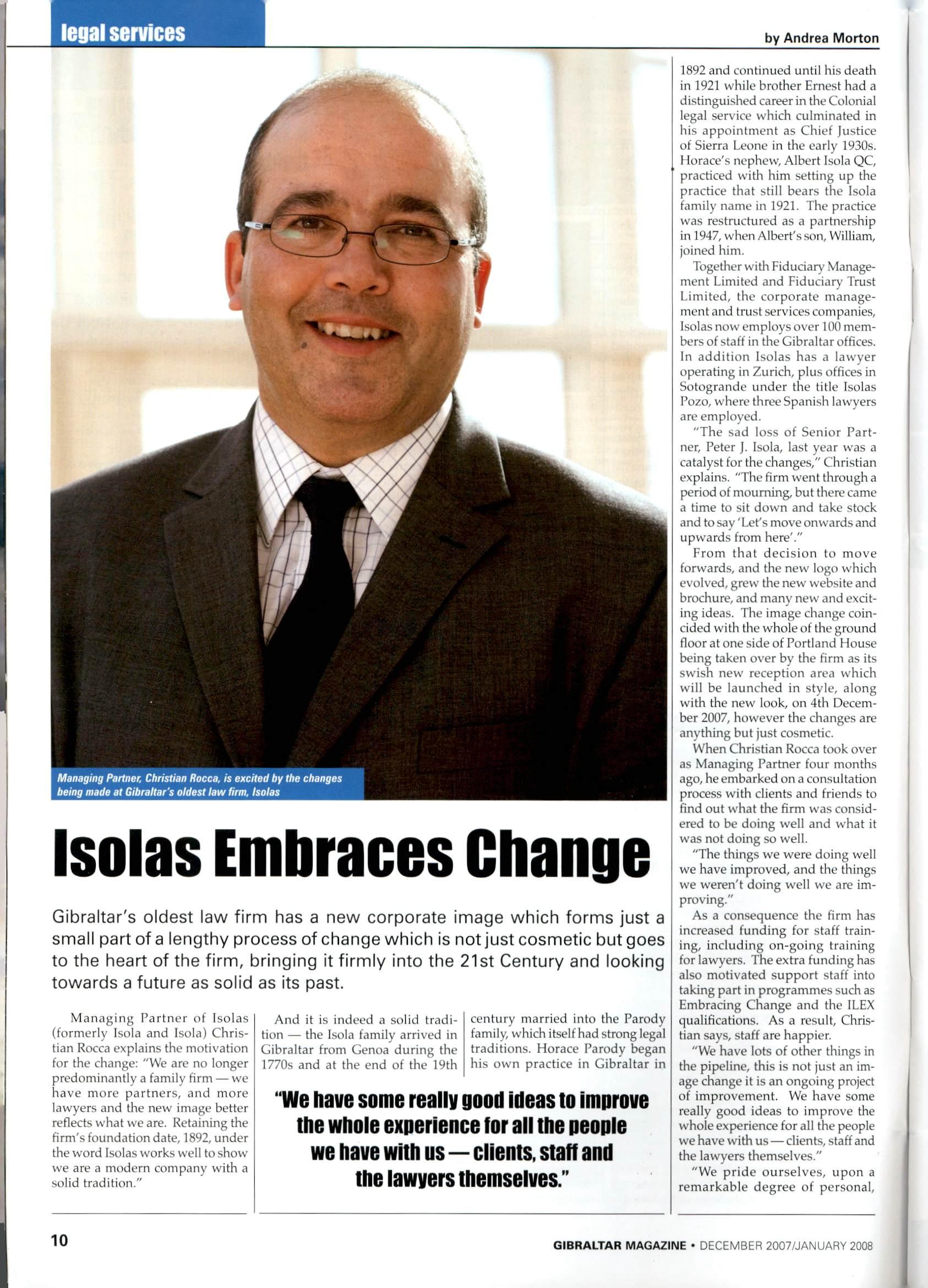Managing Partner of Isolas (formerly Isola and Isola) Chris tian Rocca explains the motivation for the change: "We are no longer predominantly a family firm — we have more partners, and more lawyers and the new image better reflects what we are. Retaining the firm's foundation date, 1892, under the word Isolas works well to show we are a modem company with a solid tradition."