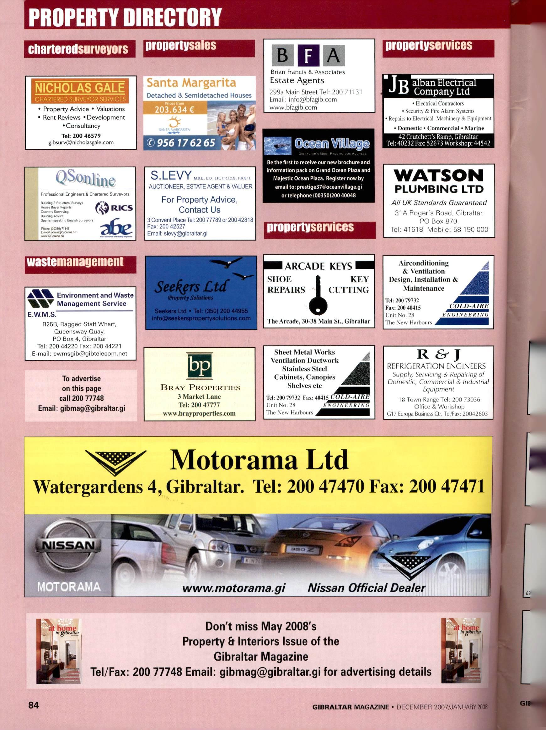 PROPERH DIRECTORY charteredsurveyors IPropertysaies NICHOLAS GALE CHARTERED SURVEYOR SERVICES Property Advice • Valuations Rent Reviews •Development •Consultancy Tel: 200 46579 gibsurv@nicholasgale.com Professional Engineers 6 Chartered Surveyo Building ti Struetufsl Surveys House Buyer Reports Quantiry Surveying BuilQing Advice Spenish speeding English SuAfeyore 711«5 (.^RICS Santa Margarita Detached & Semidetached Houses Brian Francis &. Associates Estate Agents 299a Main Street Te!: 200 71131 Email: info@bfagib.com www.bfagib.com S.LE\/Y MBE ED jP.FRlCS.FfiSH AUCTIONEER, ESTATE AGENT & VALUER For Property Advice, Contact Us 3 Convent Place Tel: 200 77789 or 200 42816 Fax: 200 42527 Email: slevy@gibraltar.gi Be the first to receive our new brochure and information pack on Grand Ocean Plaza and Majestic Ocean Plaza. Register now by email to:prestige37i|ioceanvillage.gi or telephone(00350)20040048 propertyservices propeityservices Jb alban Electrica Company Ltd • Elecirical Contractors • Security & Fire Alarm Systems ' Repairs to F-lectrical Machinery & Equipment •Domestic • Commercial• Marine 42 Crutchctt's Ramp,Gibraltar Tel; 40232 Fax:,S2673 Workshop:44542 WATSON PLUMBING LTD AH UK Standards Guaranteed 31A Roger's Road, Gibraltar. PO Box 870. Tel: 41618 Mobile: 58 190 000 wastemanagement Environment and Waste Management Service E.W.M.S. R25B, Ragged Staff Wharf, Queensway Quay, PO Box 4, Gibraltar Tel: 200 44220 Fax: 200 44221 E-mail: ewmsgib@gibtelecom.net To advertise on this page call 200 77748 Email: gibmag@gibraltar.gl bp Bray Properties 3 Market Lane Tel: 200 47777 www.braypropertie-s.coni HARCADE KEYS SHOE I KEY REPAIRS I CUTTING4 The Arcade,30-38 Main St., Gibraltar Sheet Metal Works Ventilation Ductwork Stainless Steel Cabinets,Canopies Shelves etc Tel: 200 79732 Fax: I'nii No. 2H \ I I. /< I V(, The New Harbours Airconditioning & Ventilation Design,Installation & Maintenance Tel: 200 79732 Fax: 200 40415 Utiii No. 28 ■j'he New Harbours i. W./\/ l:l<l\'0 R & J RFFRIGERATION ENGINEbRS Supply, Servk ing & Repairing of Domestic, Commercial & Industrial Equipment 18 Town Range Tei: 200 73036 Office & Workshop G17 Europa BusinL-ss Ctr. Tel/Fax: 20042603 Motorama Ltd Watergardens 4, Gibraltar. Tel: 200 47470 Fax: 200 47471 Nissan Official Deafer www.motorama.gi Don't miss May 2008's Property & Interiors Issue of the Gibraltar Magazine pM. 77748 Email: gibmag@gibraltar.gi for advertising details 84 GIBRALTAR MAGAZINE • DECEMBER 2007/JANUARY200e Gil