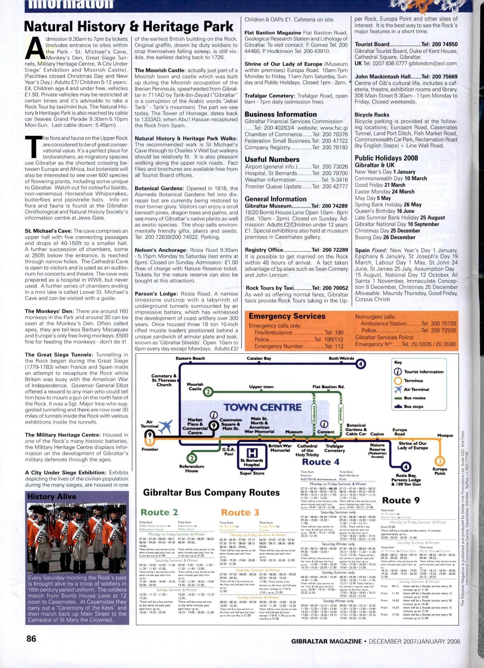 mergency calls only: Fire/Ambulance Tel: 190 Police Tel: 199/112 Emergency Number Tel: 112 Non-urgent calls: Ambulance Station Tel: 200 757 Police Tel: 200 725C Gibraltar Services Police; Emergency N":....Tel:(5)5026/(5)359i CMMm l«ich Catalan tmt Camatary 4 StThi Church ■o MmmWi Cartia ©■ Upparlown Rat Button lU. TOWN CENTRE CaaamaCM Squara* ItortiB Ni.imat American WtarM«noriy Tafnilnai C.S.A Cawwiii ■tor Q) TuurtAlnfafn IWminua A^'brmlnal mm But milM Buiftnpf Botanhai Gardanc B CablaCar Cadno Trabgar Camatarjr Caihailral o<the HohrTV^Itir Route 4 Ntture Rewpve fruiilrin Super Score Time from 8o(|)WpHd>ti Eurepa 1 Shrine'«rOur 1 I Lady«fEurope I L© Gibraltar Bus Company Routes Moftday CO Friday, $ummef & Winter 07 )& 07 4& 07 ti 074S 06 OS OdJS oa^s • 06 4S. 09.05 09.25 06 4S 0905 • 09 2S • 094S 09 45 • laiS • 1035' 05 10.15 • 10.55 • 1055 • 1) IS n.2Sr 1145* IIOS. )35* 1135BoriaB^ Panom liOdta B IMlfanGim Route 9 Route 2 Route 3 1945 Kl 15 •21.00 < 1945 *20 IS* 21.00 Satvrdsy. Summer only 07 30'OOXO* 06 30 09 00 07 30 > 06 00 '0630 *09.00 09.30* 10.00 • 10.30 09 30 * lOM* 10 30* lOSO 1! 00 120 * 1145* 1115* ThR^ -ril M a Bui MTrice en 1245. TUn .41* i M r.Siiiurn.:. ^iW.r Monday u> Prirtiy. Suntmcr SWmter 07 20 •07.40*06 00 >0615 07 20 07.40 06 00 > 0620 06.40 > 0900 09 20 • 09.40 06 40 • 09.00. 10.00... TW« ta* bl k but K M There x9 be but ttno k 4e « 4)* an but K 21 00 w^'b«M'(ir2100 ^ Sotui day Suii iicr ft Wifitci 09 20* IQ00> >0 40 • 1100 09 00 * 9 40 10.30 > MOO* 1120 - 11.40 )IOO. 11 20 II .40 1200. ThnuMbetbuttvMceitce Thft>i «>.« be 1 Out twvtee M 9* vpoamimnUMtMR 17 20 1600 1640 I9J0 1700* I740> 16.30> 1900 2000 20.40 1940 *20.20 >21.00 15 *1950 ftMre 06)0 0645 07.00 0715 07 30 07.45 0600 0& 15 06J0 0645 0900. TVm •*« hi a bM B If* 0650 07.05 0720 07.45 OaoO 06.IS 0620 0645 0900. 19.50 20.10 >20.30 2100 Prvm 07.00 There v*6l be a shuoX service ippmainiuety uptn. 2000' 20.20 2640 • 2100 S.» 1.1, /y'lf Sunday, Sunimer & Wmccr 1030* U.I0> M 50* 1000* 10.50 M»* 1110 12.30. I2J0There Mti be 4 bus Mime* tben md be s bus Mrviee 07.00 07.30 06.0D 065O 07.» > 0600 0630 09.00 09.00 • 09 30. 09 20 0950 10.30 be ■ tas Mretca lev |.OO..T>«re Ml be I but MheuratfMpiisiMbnr wnm on S« hour »d Mfjut (he hour («acWK 17 20* i7 50).»Bi.3IOO '"liuil, >, inir'i .li nr, 06.00 •06.30 09.00 09.30 0900 > 09.30 lOM 10.30 1000 10.30. 1050 M20 12.00 lUO Tlwe wW ta a bui cwtce an Ttwax* 2),0D Saturday,Wmter only 07.30 * 0610 * C6.50 • 09.00 07 30 *06 10 > 06 50 * 09.30 09.30* 1000* 10)0* 1015* 1045 > 1.20* II SO I.GD.. 1115 * 13 45... Thm oin M I Sunday. Summer onfy 06»* 0900* 09.50* 1000 06.30 * 09.00 *09^0* IC 00 lOM* 1100.. 10 30* 10 50 > 1.20* )45 Thre Be temw 1215* 1245 Thwe-i W a iaici SWint 16)0* 1630 1645 > 19,05 I7 55 > 16.15 1630 > I6S0 19.20* 19.40 1955 * 20-30 19.05 > 19.25 19.40 2000 2100 20 IS >20.45 4W., *rem 1145 Sunday.Winter only 09.00*09.30* 1010* 10 50 09 00 * 09.30 > 10)0* 10.50 M^* 12.20 > 13.00* 13 40 M.30* 1220* )3XiO* 13.40 I4X- ISOO* 1540* 1620 1420* 1500* 15.40* 1«2D 1700* 17 50* IBM* 19 10 17 )0 - 17,50* I6»* 19 10 I9J0* 20 30 • 21 00 1930 • 20 30 • 21)30 diere «ril be k ShjcM varrice ■very X 11.45 ibe^ ei*l be e Shucde tenoce iS rmiuMwpCo 14,X there eril be » Shucde aerrtee eweiy 30 iwimupta 1430 dtert Mlbe k ShutOe t«r«ice every '6 mbytes I7X diere wfB be » 9*uD)e terrice every 30 up u 2! 00 [35 f «2 oS 5 I, I I 4 a 86 GIBRALTAR MAGAZINE • DECEMBER 2007/JANUARY 2008