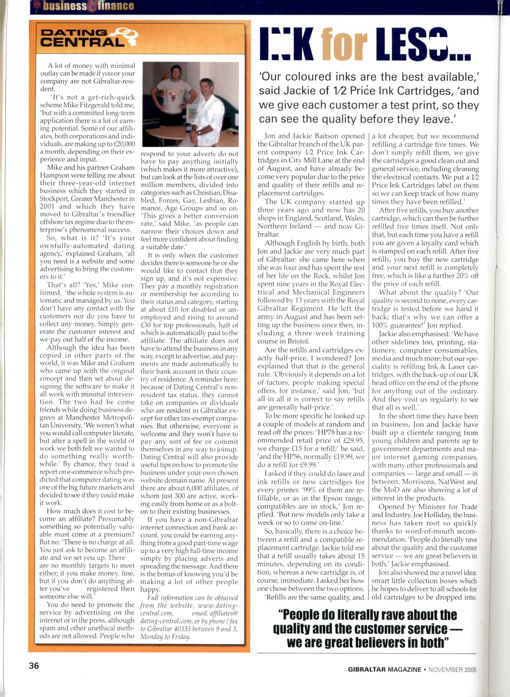 InkJet Cartn€lges Professionally Recharged MASSIVE SAVINGS ON THE PRICE OF A NEW CARTRIDGE 4th Generation InkJet recharging machine from the USA 10 GIBRALTAR MAGAZINE • NOVEMBER 2005