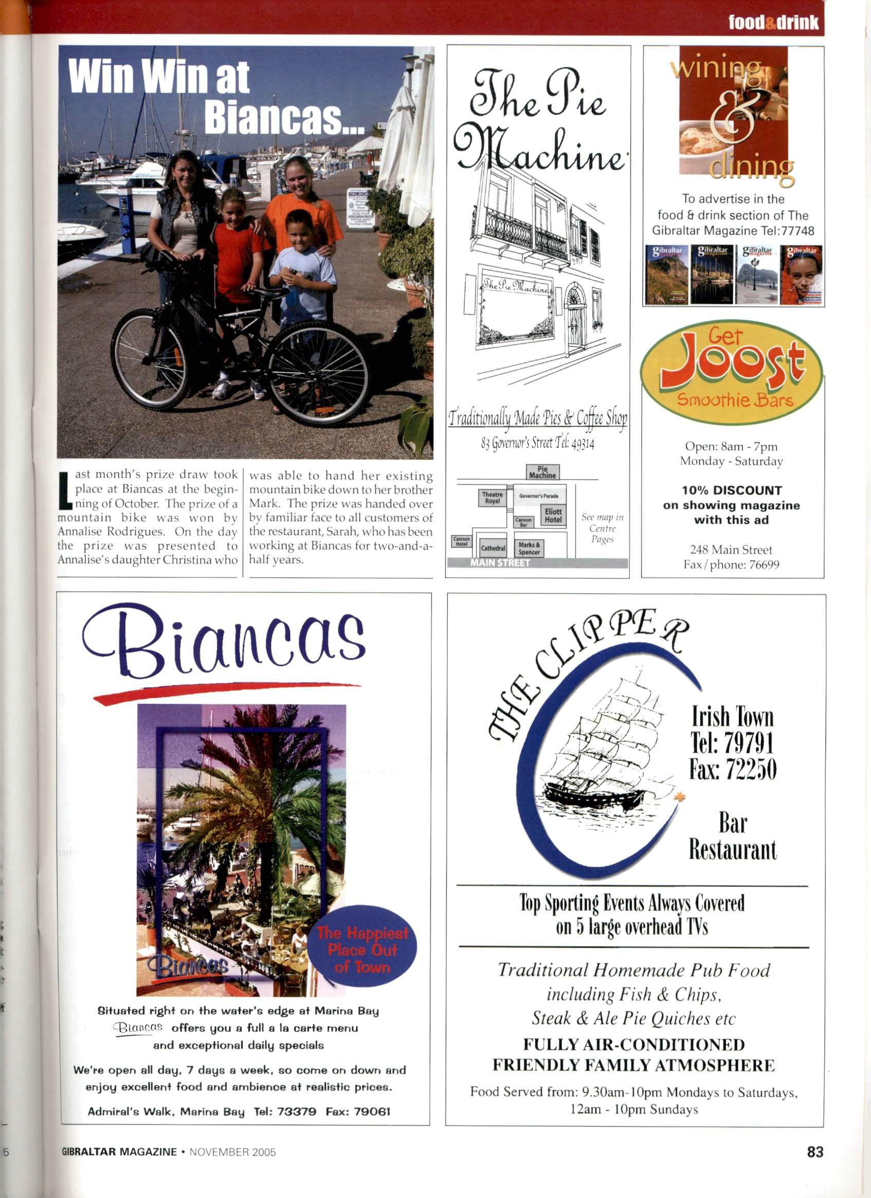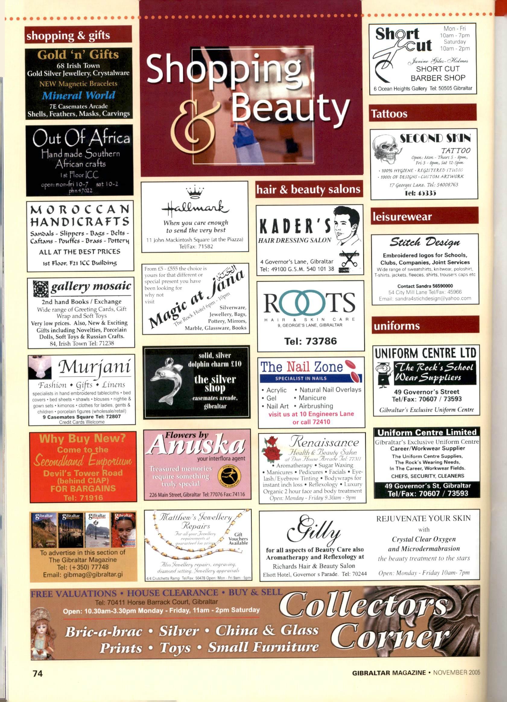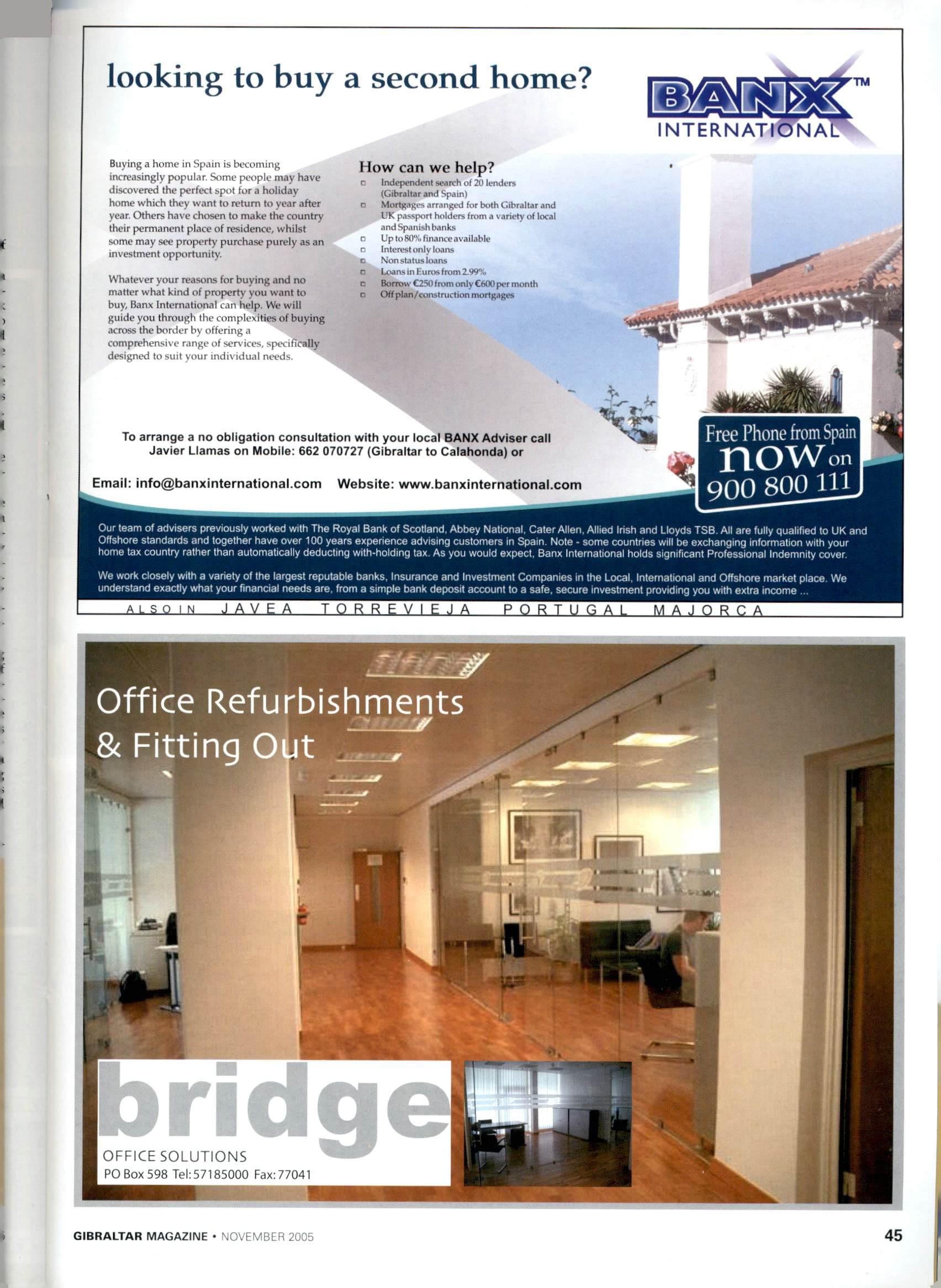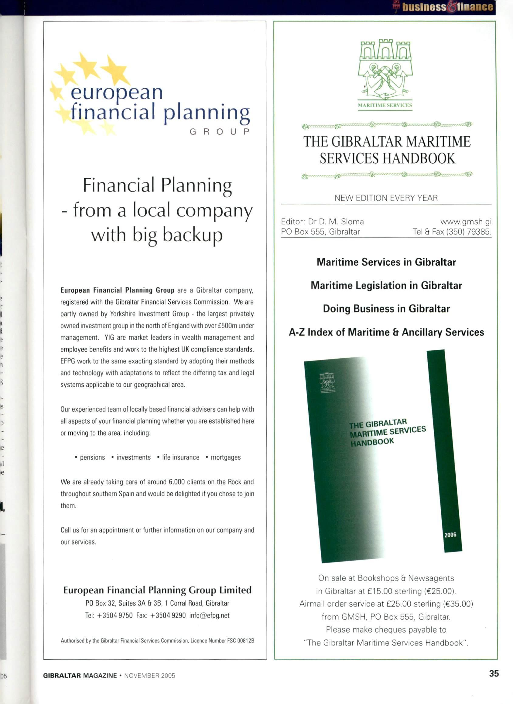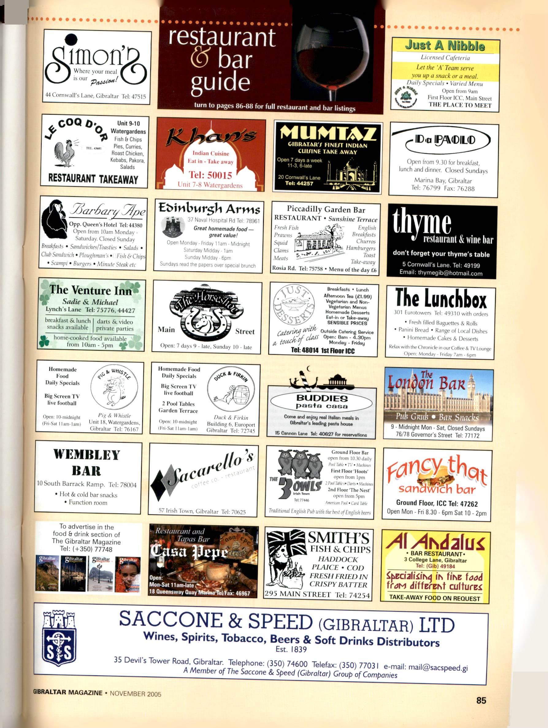 SAILORS'GUIDE on sale at £5.00 at chandleries & bookshops MMonF-i9/.Sat;Sijti i0-4 All English Newspapers Sunday Papers Take-away Sandwiches b Anmir.ai <; Walk Best Nautical Selection bmr'::'\37B3 <>< books and Charts <1 yo'raut'ca'i"'ews»gfrnt''.-''-c)t"i,iii i.o'n w ww a oomaut ca 'nws.njen: co ux THE GIBRALTAR MARITIME SERVICES HANDBOOK 2005 edition Now on sale at Gibraltar Bookshops Vv See^rs Ltd Property Solutions Suite 11,3 Turnbull's Lane, Gibraltar Tel: 44955 Fax:45664 Email: seek,ers@gibtelecom.net Rentals,Property Management - Commercial and Residential Re-sales, New Developments - Homes and Investments ~ 100% Mortgage Finance Possible for Spanish PropertiesGIBRALTAR MAGAZINE • NOVEMBER 2005 93