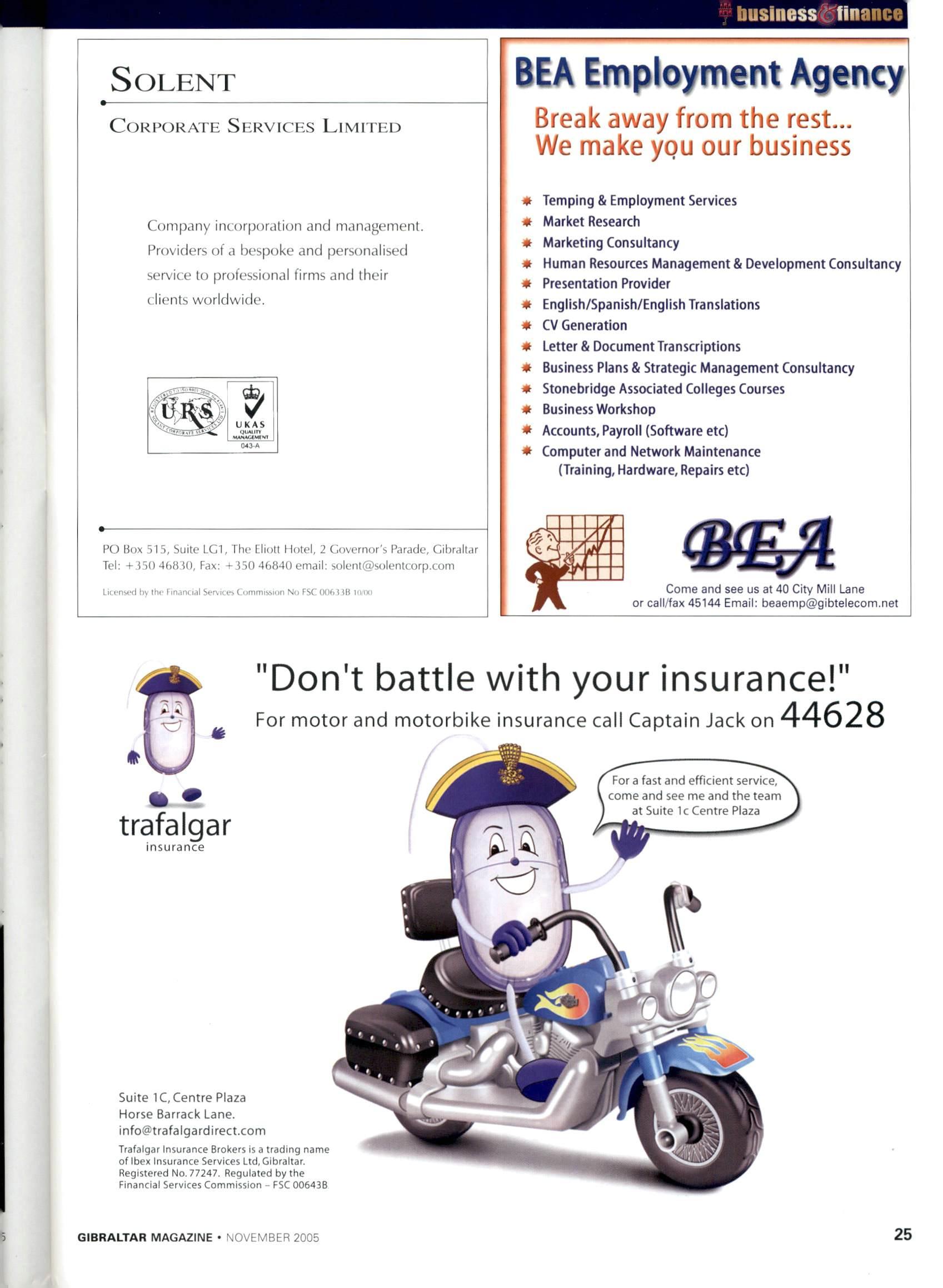 Early in October Trafalgar Insurance opened a local office (see page 24) and a few days later Quest Insur ance Management opened to offer Gibraltar residents and others a full range of insurance services.