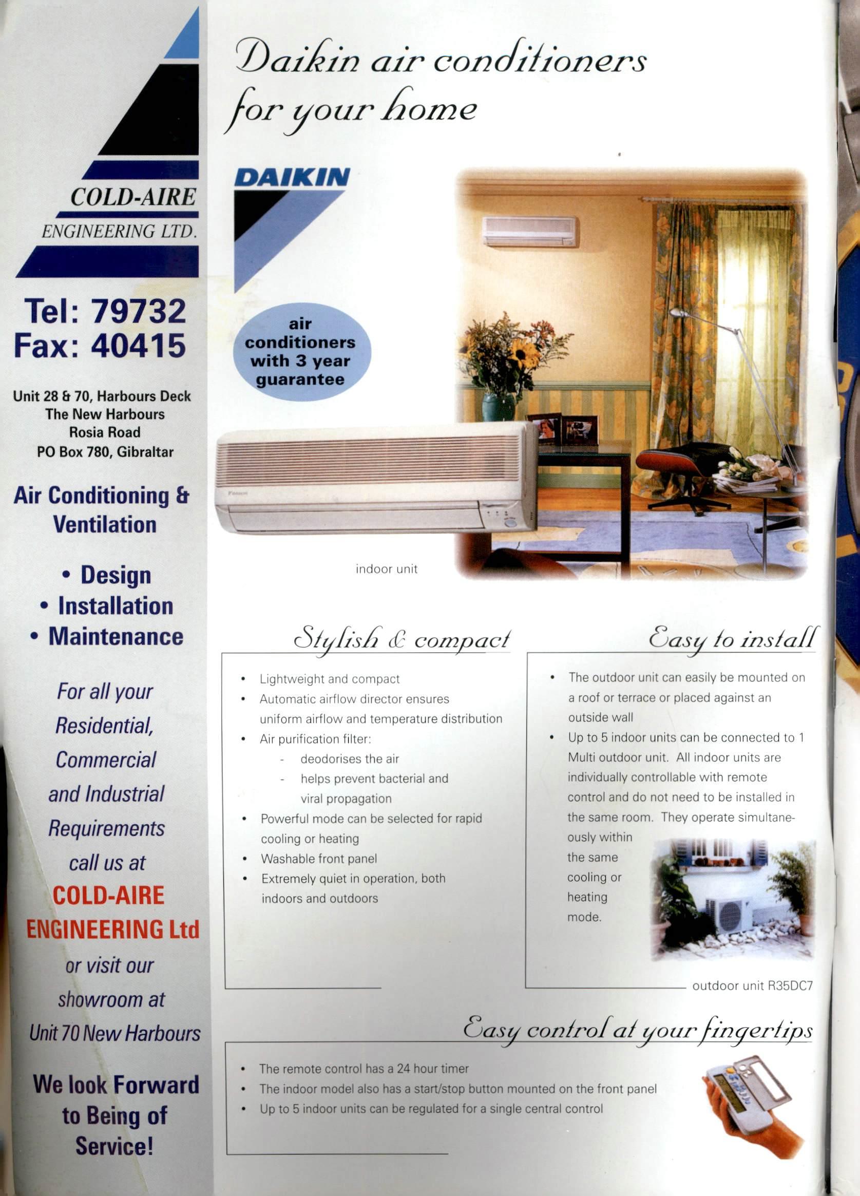 COLD-AIRE ENGINEERING ETD. Tel: 79732 Fax: 40415 Unit 28 8 70, Harbours Deck The New Harbours Rosia Road PO Box 780, Gibraltar Air Conditioning fr Ventilation • Design > [nstallation Maintenance