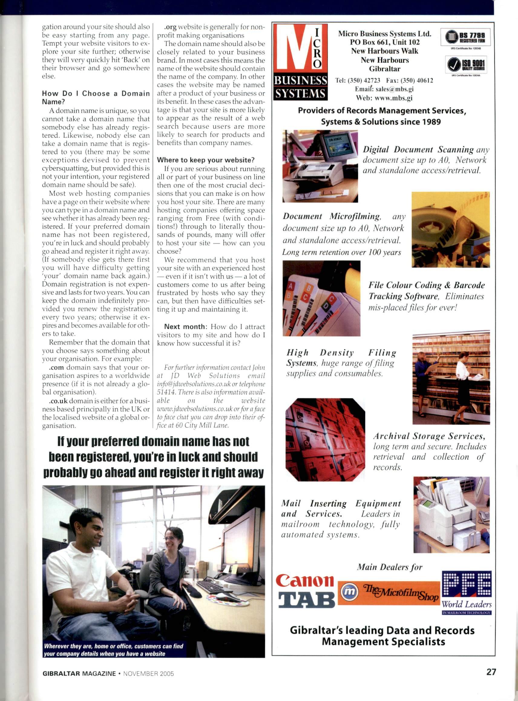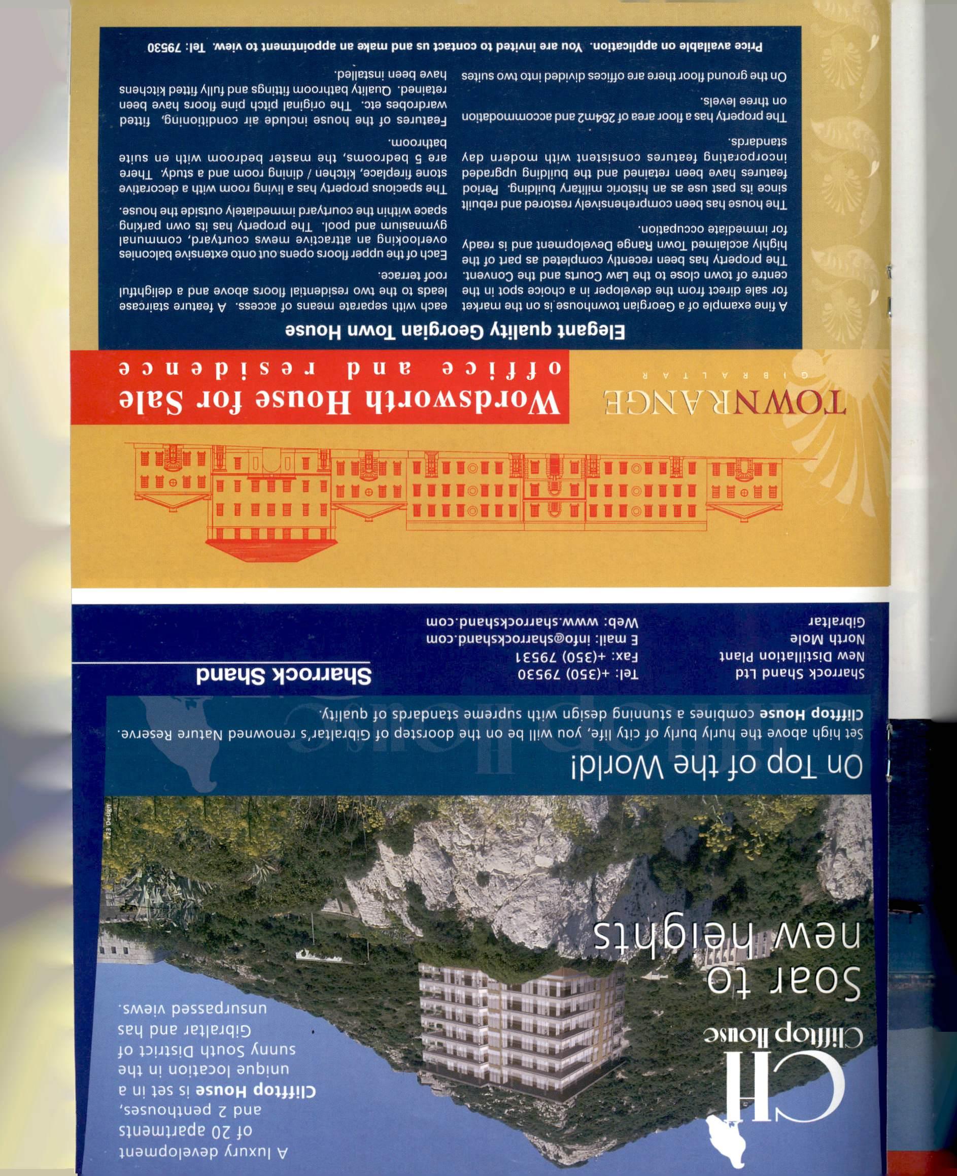 IN 1 t;N \ l H IN \ l ( < l\1\ll NK At H )SS FecEx ^2027 CARtllV spnng I MEMBERS OF THE ICOM CROUP OF CQMPANIET SERVICE LEADERSWorldwide Services; •Same Day service to Andalusia•Local Deliveries •24/48hr services to major European cities Mail Boxes: •450 mail boxes •Serviced daily Virtual Office Services: •Fax, Photocopy•Post and Mail forwarding Money Transfer: •International money transfer•Personal and Company Transfer•Competitive rates•Personalised service Bureau de Cfrange: •Competitive rates. CONTACT US; 1 /5 IMOSSl HOUSE IRISH TOWN GIBRALTAR TEL: +350 762 i 6 / 42467 FAX: +350 48697/ 42465 email: info@mrw,gi For allyour investment and life assurance needs • Mort^a^c Plans • School Fee Plans • Savings • Endowments Traded Endowment Policies &. more... PRESCOTT INSURANCE 2 Irish Toiyii Giimiloir Tel: 51666 Fax: 51333 Sole Ajjents lor Sun Alliance Sl London PLC Internet Connectivity is only a local phone call away GibNet Inlernct Providers & Network Specialists Dial-up Accounts Personal Web Pages Free Web Pages for local charities, schools and non-profit organisations Commercial Web Sites from only £25 p>er month Tel: 47200 GibNet Limited Networking Gibraltar to the Rest of the World Suiti' U.l Eurotnwers, PO Uox 797, Cibr.tlinr Career File: