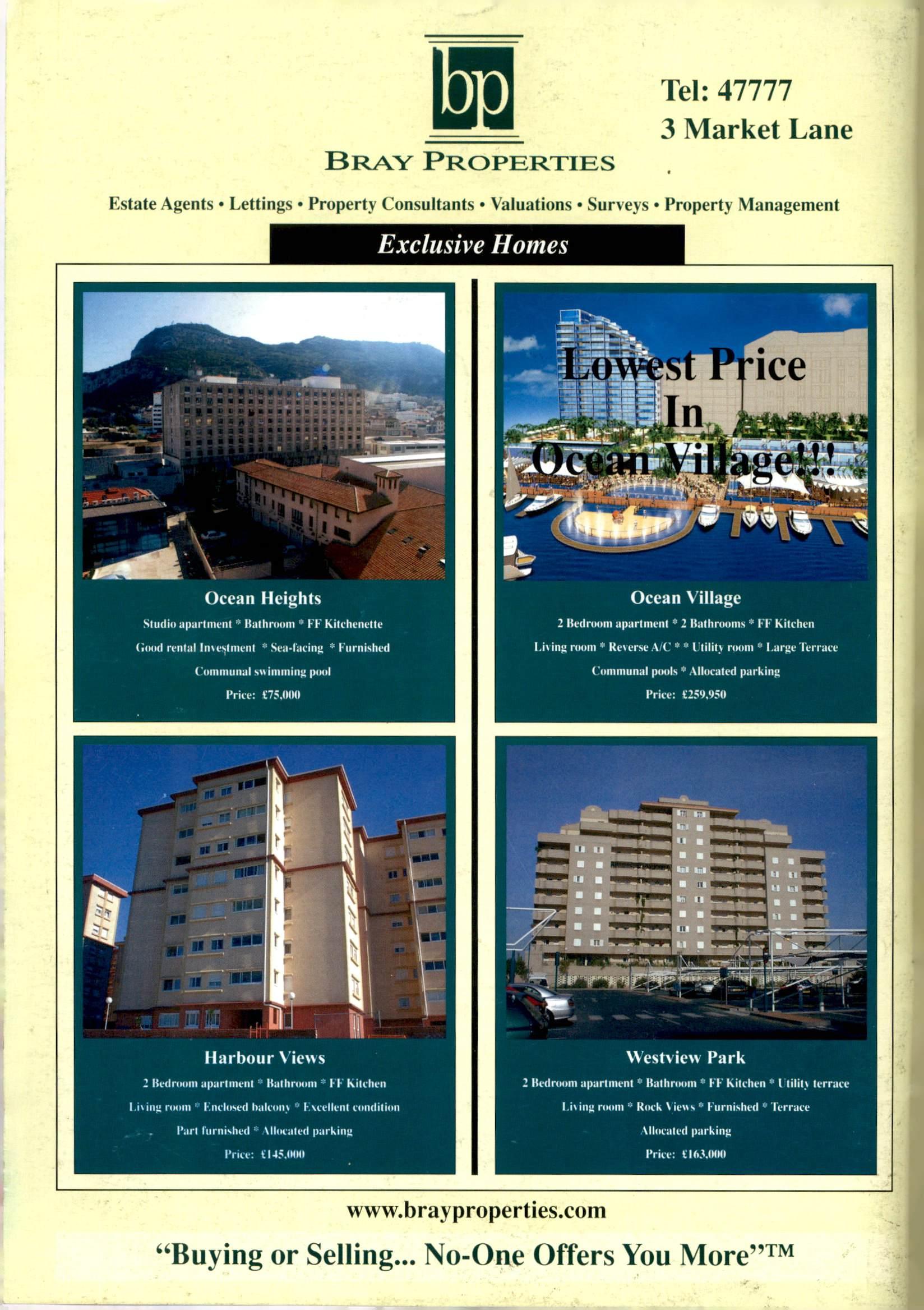 Properties Estate Agents • Lettings • Property Consultants • Valuations • Surveys• Property Management Exclusive Homes Ocean Heights Studio apartment"Bathroom "FF Kitchenette (iood rental ]nve<;tment * Sea-facing * Furnished Communal sulinming pool Price: C75,(M» Harbour V tens 1 Bednatm apartment Kathnami ^ FK Kitchen Living HHim '' Fnclosed halcoiiv * F\ceik-nl condition Part furnished Alhwaled parking Price: CI45.INHI Ocean Village 2 Bednaim apartment * 2 Bathrooms * FF Kitchen laving room * Reverse A/C••L-tllitv room •Large Terrace Communal pools * Allocated parking Price: «259.950 NVestview Park 2 Bi-dnmm apartment * Bathnaim * FF Kitchen * (tilitv terrace Living nH>m "Rttck Views * Furnished * Terrace Allocated parking Price: £i63.(NH) www.brayproperties.com "Buying or Selling... No-One Offers You More"™