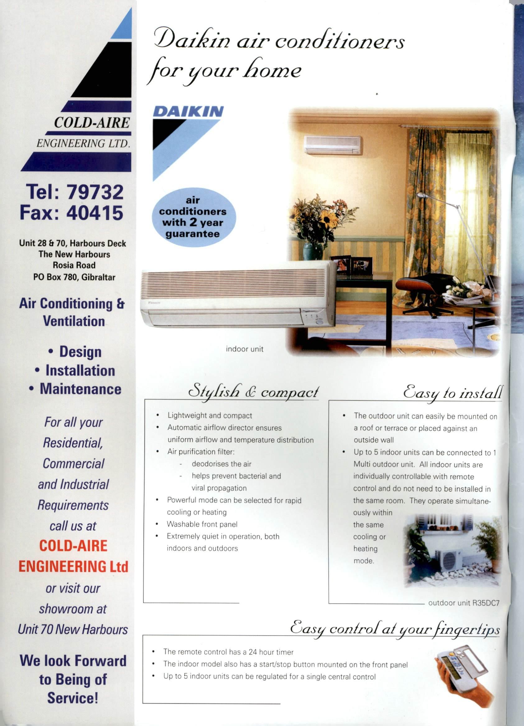 COLD-AIRE ENGINEERING LTD. Tel: 79732 Fax: 40415 Unit 28 £r 70, Harbours Deck The New Harbours Rosia Road PO Box 780, Gibraltar Air Conditioning b Ventilation • Design • Installation • Maintenance For all your Residential, Commercial and Industrial Requirements call us at COLD-AIRE ENGINEERINGLtd or visit our showroom at Unit70 New Harbours We look Forward to Being of Service!