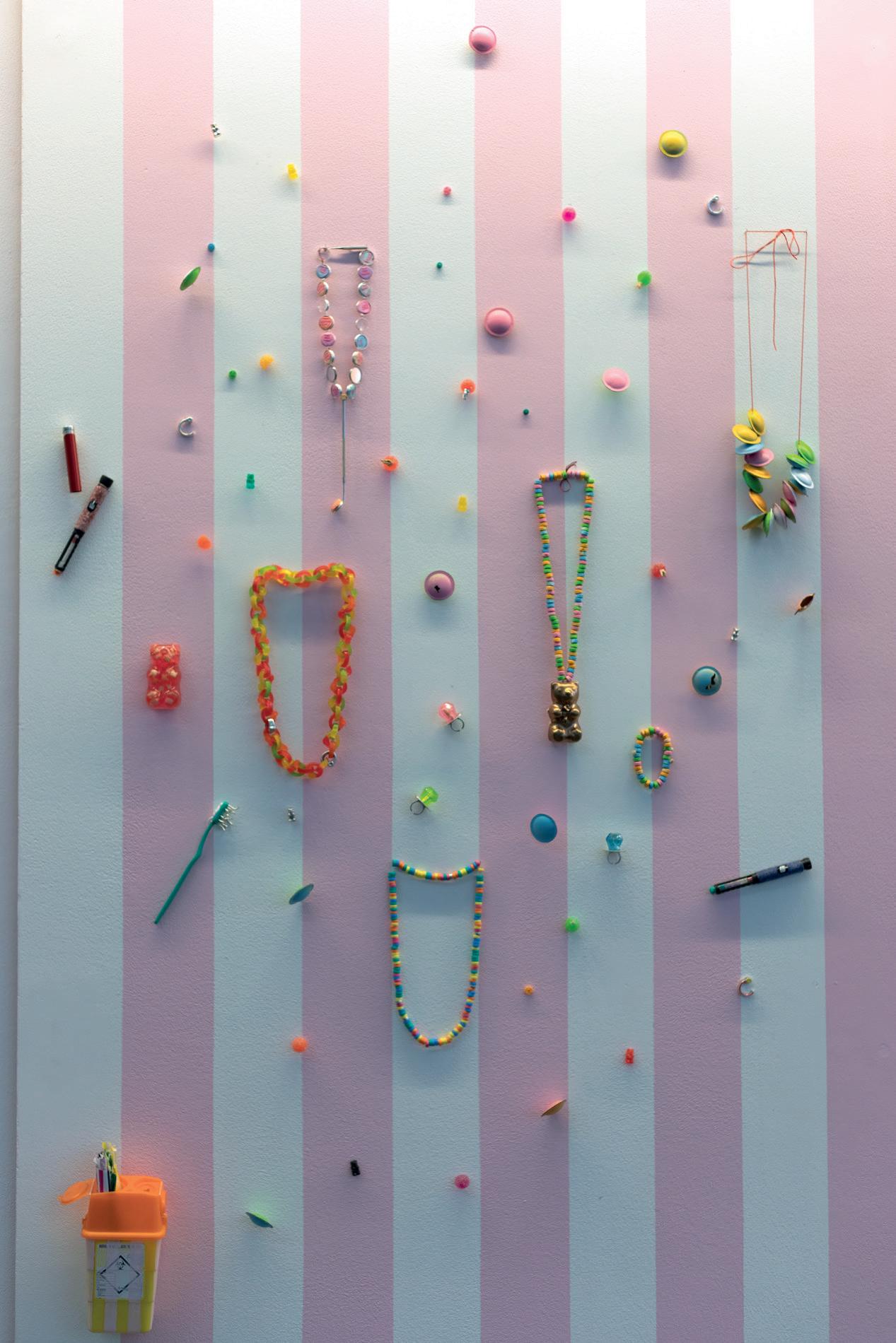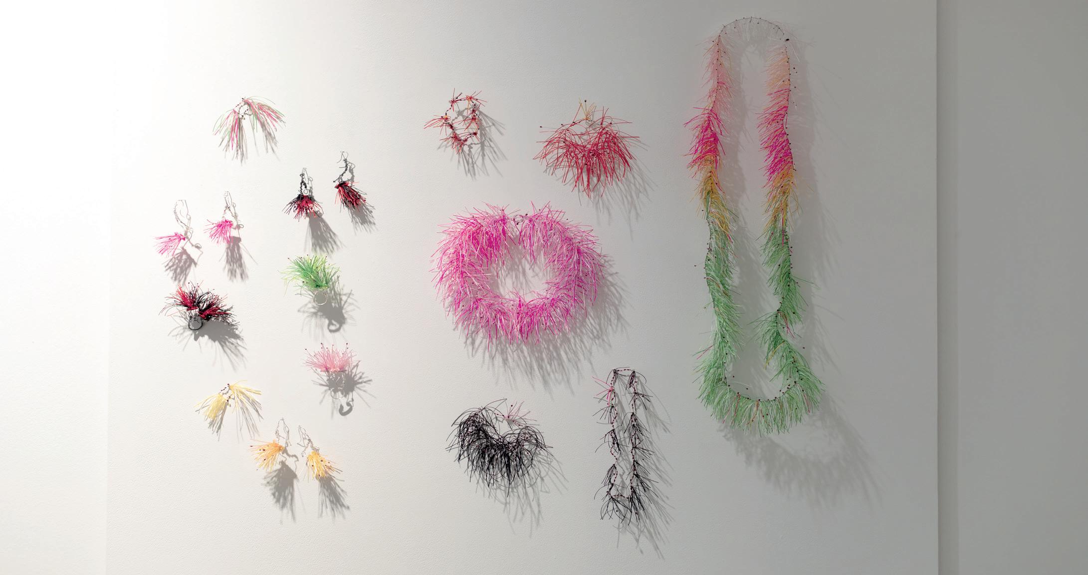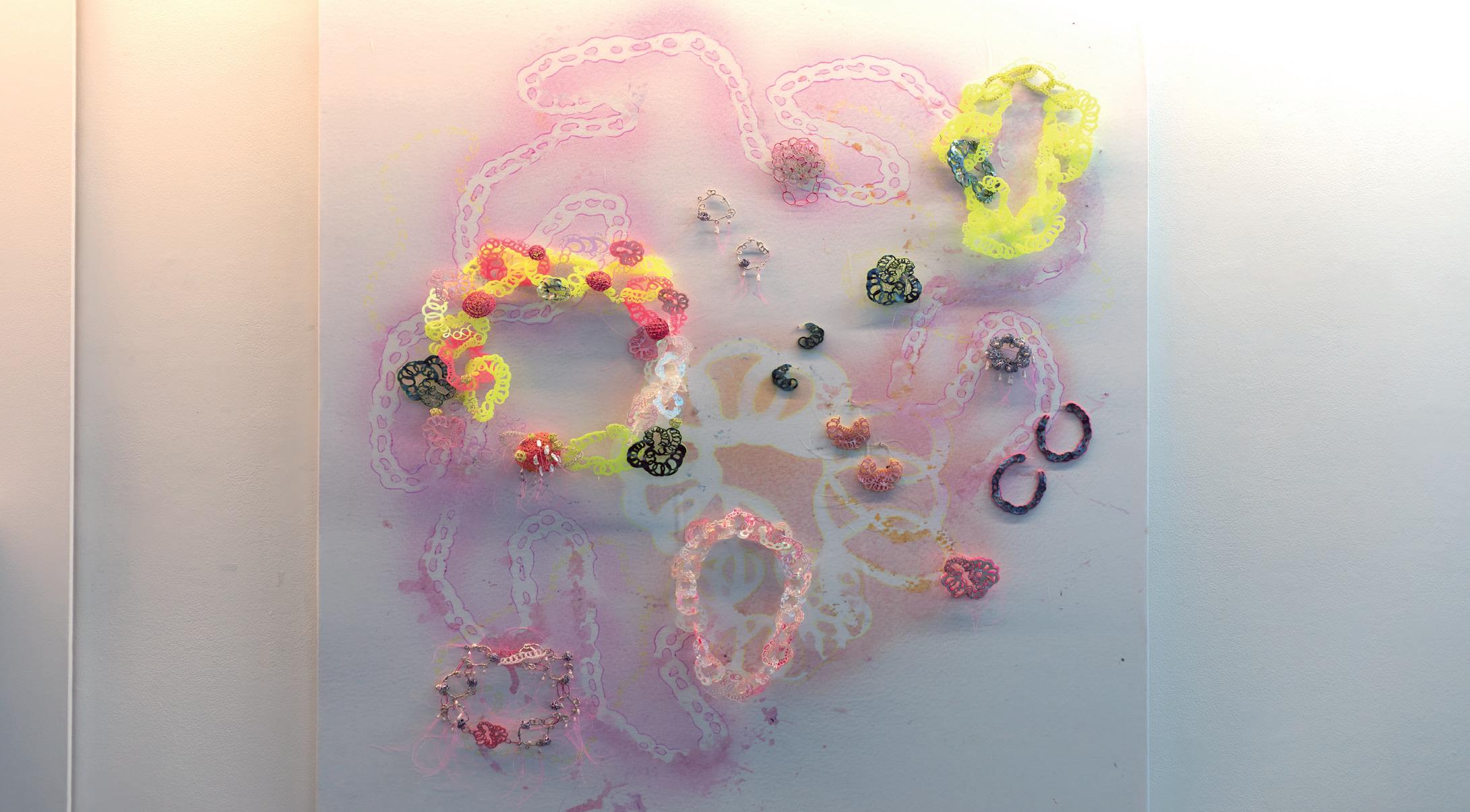 white precious metal, mother of pearl, acrylic, nylon thread, neon acrylic paint