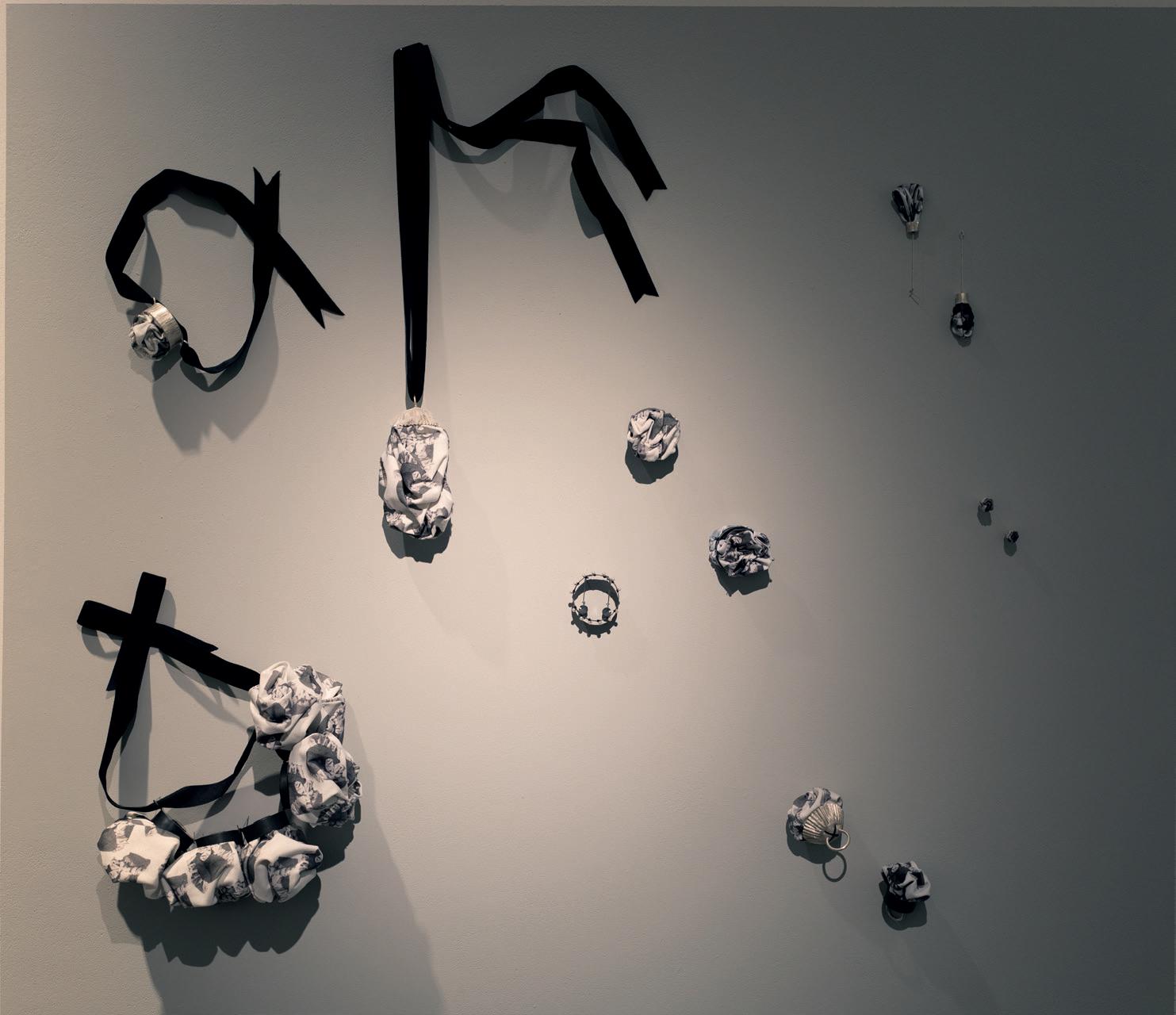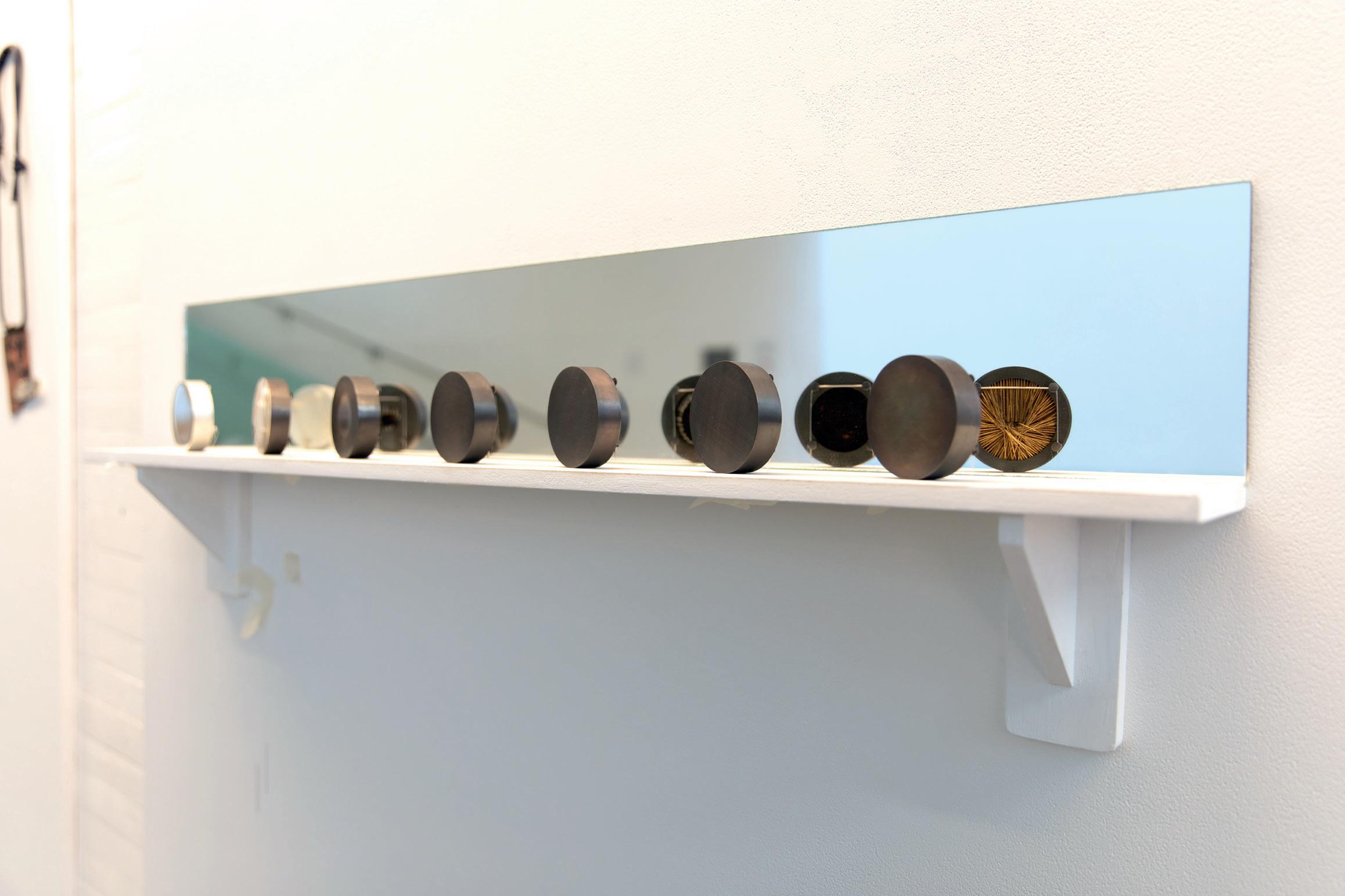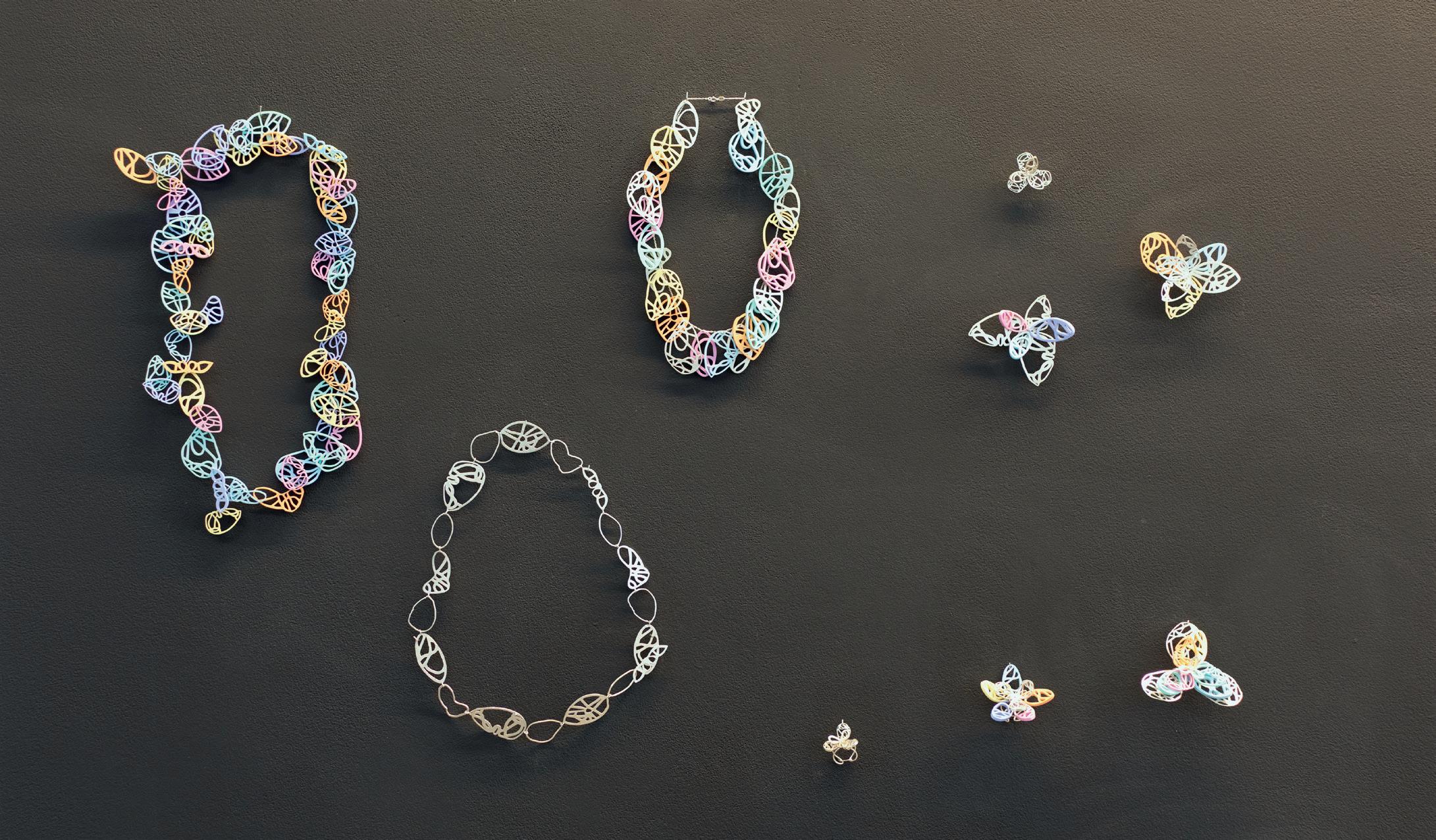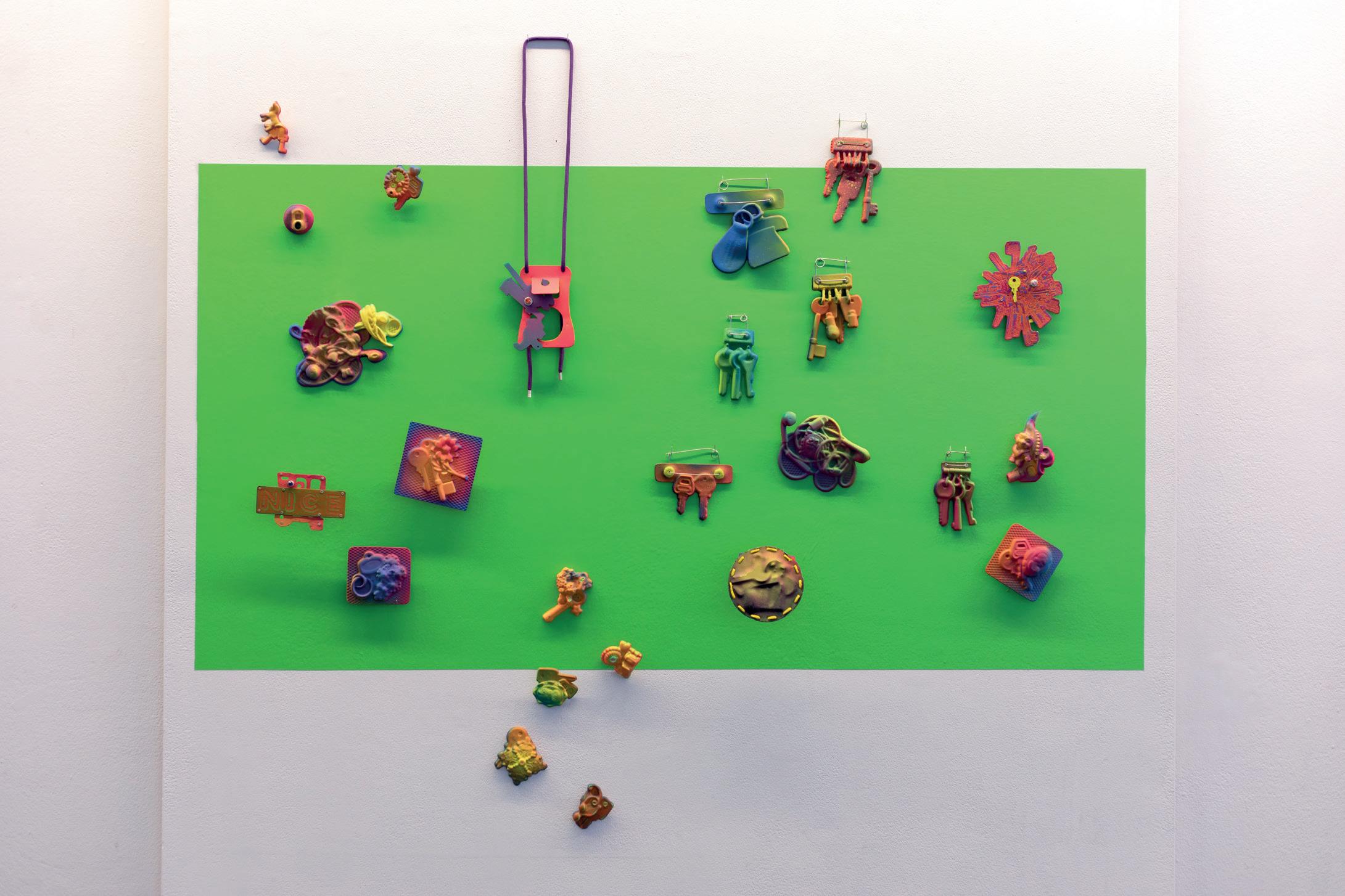 white precious metal, mother of pearl, acrylic, nylon thread, neon acrylic paint