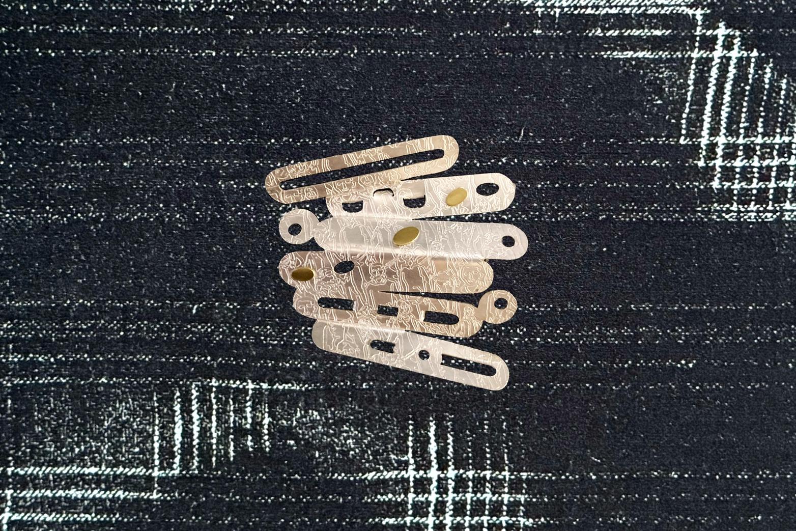 Representing my daily journey from home in Edinburgh to the School of Art in Glasgow, the shapes in this brooch are drawn from textures and patterns on platforms and trains. Etched in to the surface are my fellow travellers from both cities.