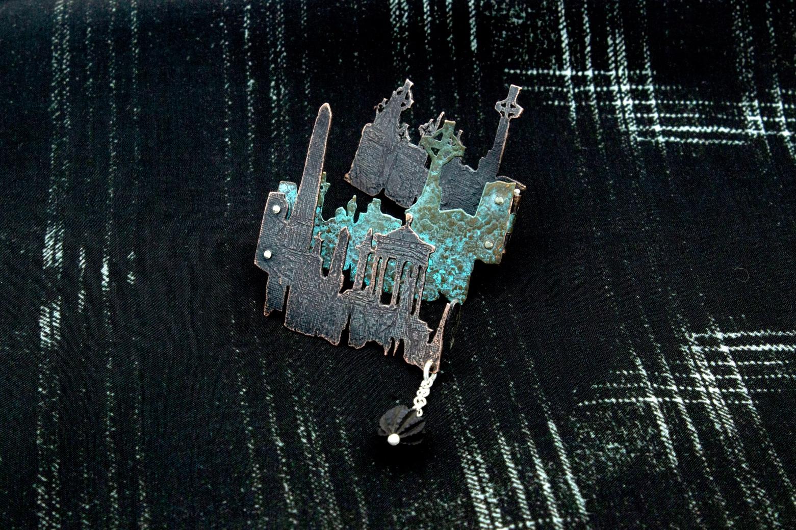 The Glasgow Necropolis, City of the Dead, is a large Victorian Era cemetery that sprawls across a hill, home to 3,500 tombs and 50,000 burials. The articulating panels of this brooch layer to resemble the winding walk up the hill and the ‘city skyline’ the gravestones create. Patina is utilised to emulate the decay on the stones. Suspended from the tiered landscape is a repurposed bogwood bead, a reference to Victorian Era mourning jewellery.