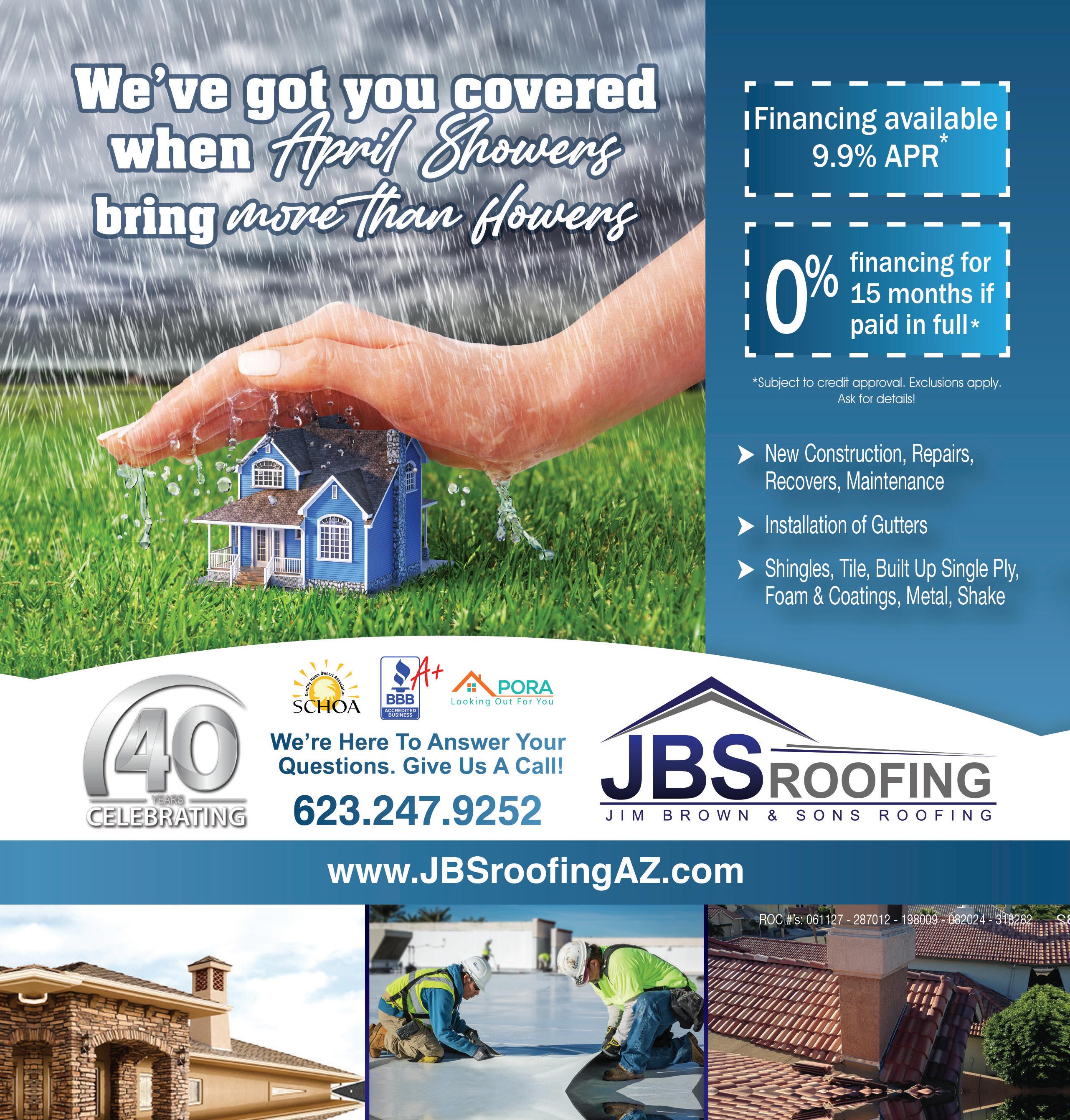 14 THE GRAND SEASON • APRIL 2024 WWW.THEGRANDSEASON.COM WE DO WEEDS! P r e - E m erge nt T r e atm e n t * St o p w ee ds a t th e s ee d P ost- E m erge nt T r ea tm e n t * Stop g r o wth, Eli m i n a t e th e sou r c e Gra ss T r e atm e nts A vaila b l e Cust o m P r o gra ms A vaila b l e To p T ie r App lie d S cie n c e 10404 W COGGINS #101, SUN CITY, 85351 TREATMENTS START AT $99 YourWEEDGUY.com LICENSE #9002 TRIDE TRUE AND PEST•WEEDS•TERMITES 623-518-4527 PEST AND TE RM ITE C O N T R OL, LL C Kool Decking Exterior Painting Custom Interior Painting FAMILY OWNED & OPERATED SATISFACTION GUARANTEED! 623-340-9866 623-340-9866 FOR ALL YOUR PAINTING NEEDS PROMOMENTIONCODE GS0424FOR $50OFF YOURORDER! FREE ESTIMATES DesertMesaPainting.com 623-434-3777 480-898-3777 www.azenergy.com LICENSE NO. 267773 BONDED RAIN GUTTERS • 5 or 6 Inch • 6 Inch Half Round • 30 Colors • Custom Fabrication • Seamless Rain Gutters SUN SCREENS • 80% & 90% Textilene • Variety of Color s Mention Promo Code when you spend $250 or more on any of our sun screens or rain gutters! FREE ESTIMATES You will always get the best completed job for the money! ENERGY-04 & SAVE 10%