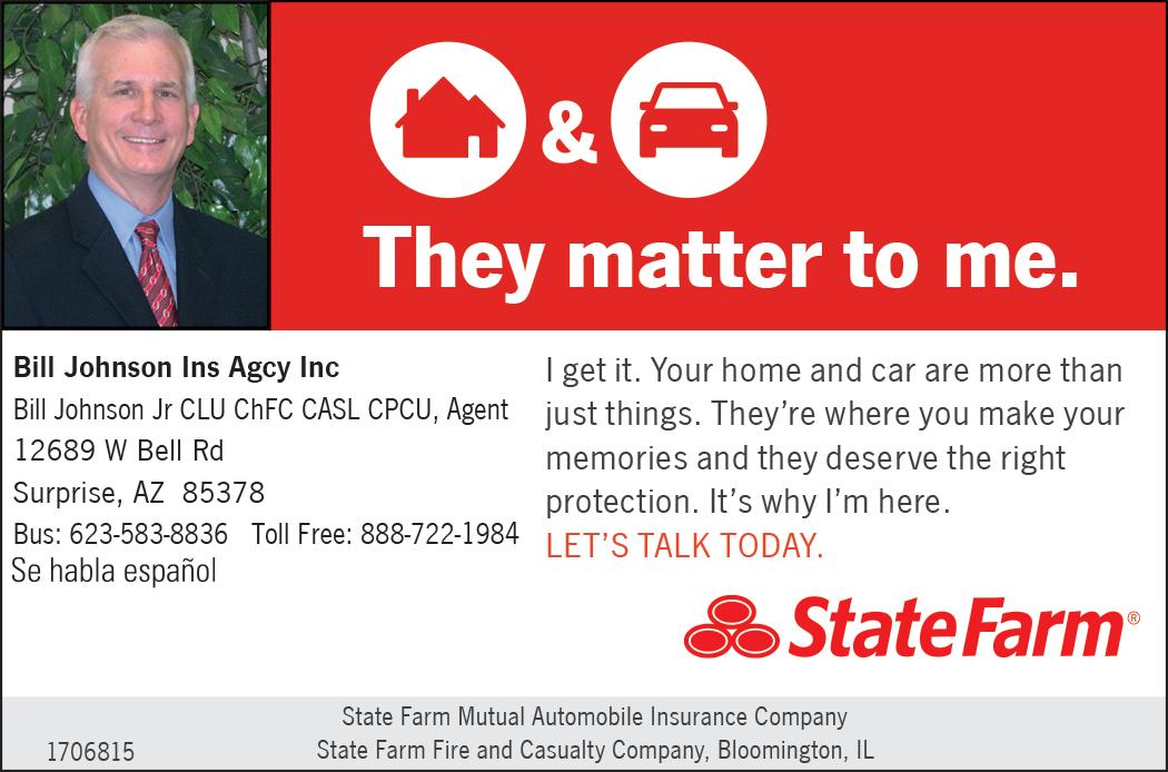 her 16th Year! The AARP Automobile Insurance Program from The Hartford is underwritten by Hartford Fire Insurance Company and its affiliates, One Hartford Plaza, Hartford CT 06155. In Washington, the Program is underwritten by Trumbull Insurance Company. AARP and its affiliates are not insurance agencies or carriers and do not employ or endorse insurance agents, brokers, representatives or advisors. This program is provided by The Hartford, not AARP or its affiliates. Paid endorsement. The Hartford pays a royalty fee to AARP for the use of AARP’s intellectual property. These fees are used for the generalpurposes of AARP. AARP membership is required for Program elgibility in most states. Applicants are individually underwritten and some may not qualify. Specific features, credits and discounts may vary and may not be available in all states in accordance with state filings and applicable law.The premiums quoted by an authorized agent for any Program policy include the additional costs associated with the advise and councel that your authorized agent provides. Dave Mitchell, CPCU, CIC, MBA Ideal Insurance Agency dave@idealins.com 14239 W. Bell Rd., Ste 205 Surprise, AZ 85374 www.idealins.com Call for your FREE, no-obligation quote 623-933-8263 IDEAL INSURANCE AGENCY Auto Insurance Program from “Ask me about the AARP® Auto & Home Insurance Program from the Hartford.” Now available in your area! This auto insurance is designed exclusively for AARP members — and is now available through your local Hartford Independent agent! WE DO WEEDS! P r e - E m erge nt T r e atm e n t * St o p w ee ds a t th e s ee d P ost- E m erge nt T r ea tm e n t * Stop g r o wth, Eli m i n a t e th e sou r c e Gra ss T r e atm e nts A vaila b l e Cust o m P r o gra ms A vaila b l e To p T ie r App lie d S cie n c e 10404 W COGGINS #101, SUN CITY, 85351 TREATMENTS START AT $99 YourWEEDGUY.com LICENSE #9002 TRIDE TRUEAND PEST•WEEDS•TERMITES 623-518-4527 PEST AND TE RM ITE C O N T R OL, LL C