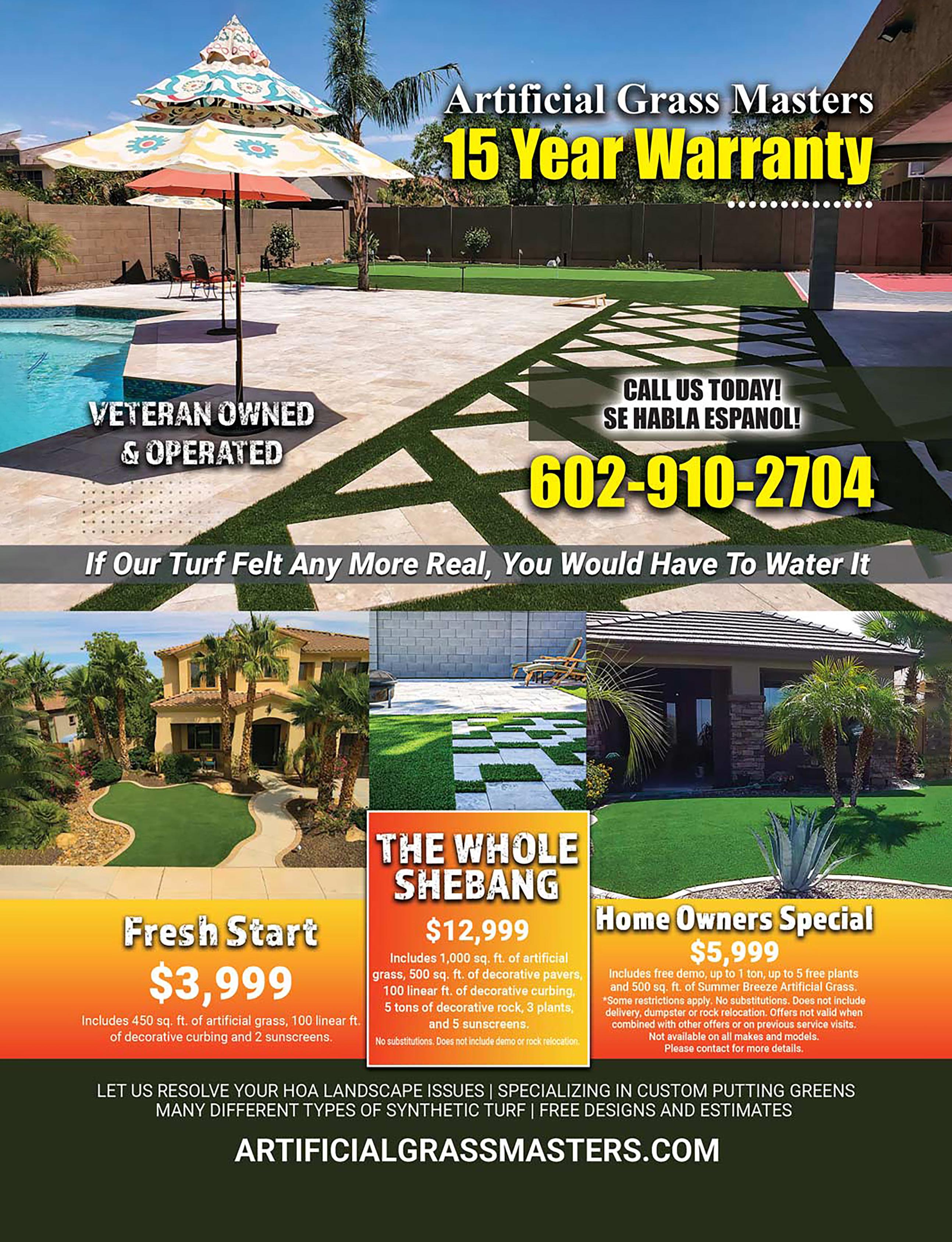 OCTOBER 2022 • THE GRAND SEASON 41FOR ADVERTISING INFORMATION CALL (623) 594-1630 WE WILL BEAT OUR COMPETITORS’ PRICES. SHOP AND COMPARE! ArizonaTurfProfessionals.com Prices include all materials and installation! $2000 job minimum. ROC 328529 Additional discounts available for Veterans, First Responders and all Essential Workers. 623.280.1992 Call for a consultation today! TRUST YOUR ARTIFICIAL TURF PROJECT TO US TAKE BACK YOUR WEEKEND! Pet & Kid Safe Reduces Water Bills No More Mowing Easy Cleaning Long Lasting Environmentally Friendly starting at TURF PAVERS CURBING TRAVERTINE IRRIGATION $4.95 Artificial Turf SQ. FT. starting at $12.95 Travertine SQ. FT. starting at $7.75 Phoenix Pavers SQ. FT. 0% Financing O.A.C. Offer Expires 11/15/22