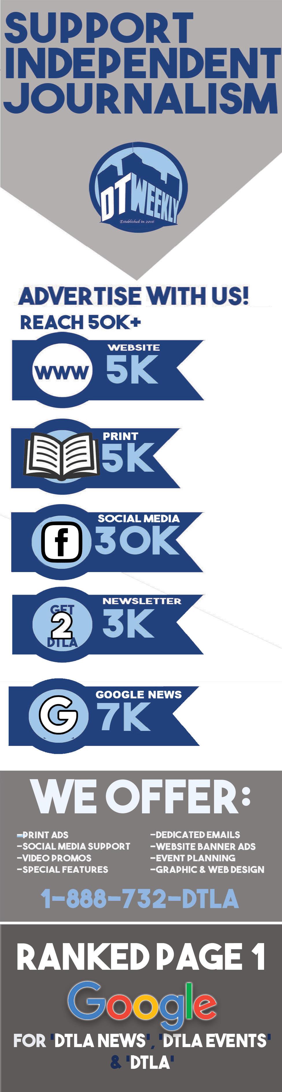 All rights reserved. Downtown Weekly is a news, event, LIFESTYLE & Hospitality FREE community resource. No portion of this publication may be reproduced without express written permission from the publisher. DTLA WEEKLY, in support of local residents, businesses, workers and visitors of Downtown Los Angeles, publishes DTLA WEEKLY.