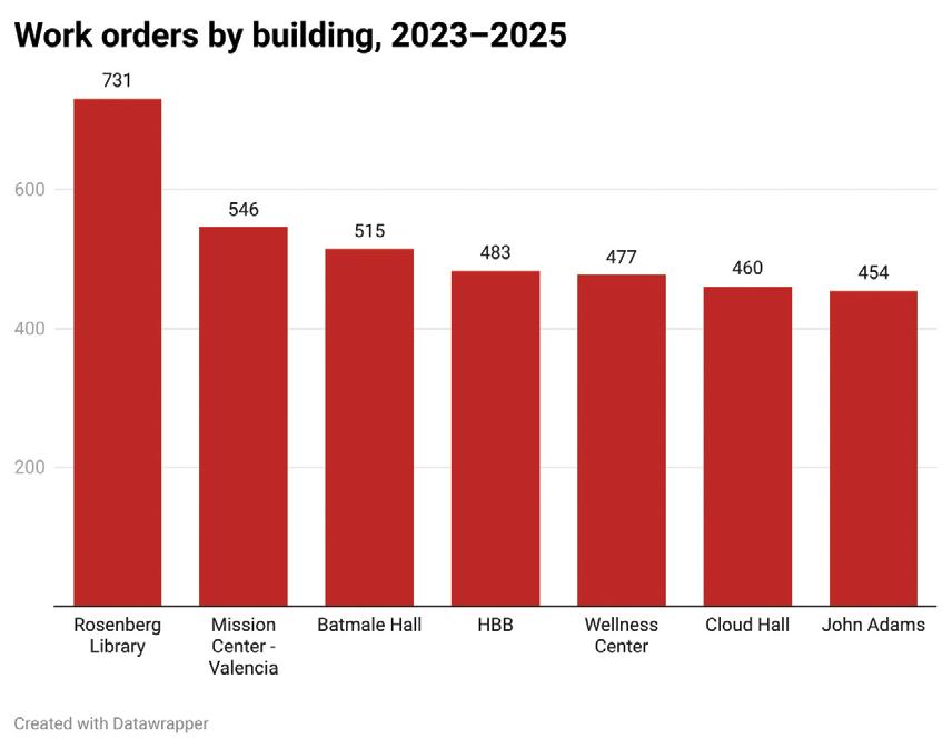 From 2023 to 2025, City College logged over 7000 work orders across 52 buildings. Ocean Campus' Rosenberg Library, which celebrated its 30th year this month, accounted for roughly 10% of all requests, significantly more than any other site. Other problem buildings included Valencia at Mission Center, Batmale Hall, the Harry Britt Building and the Wellness Center.