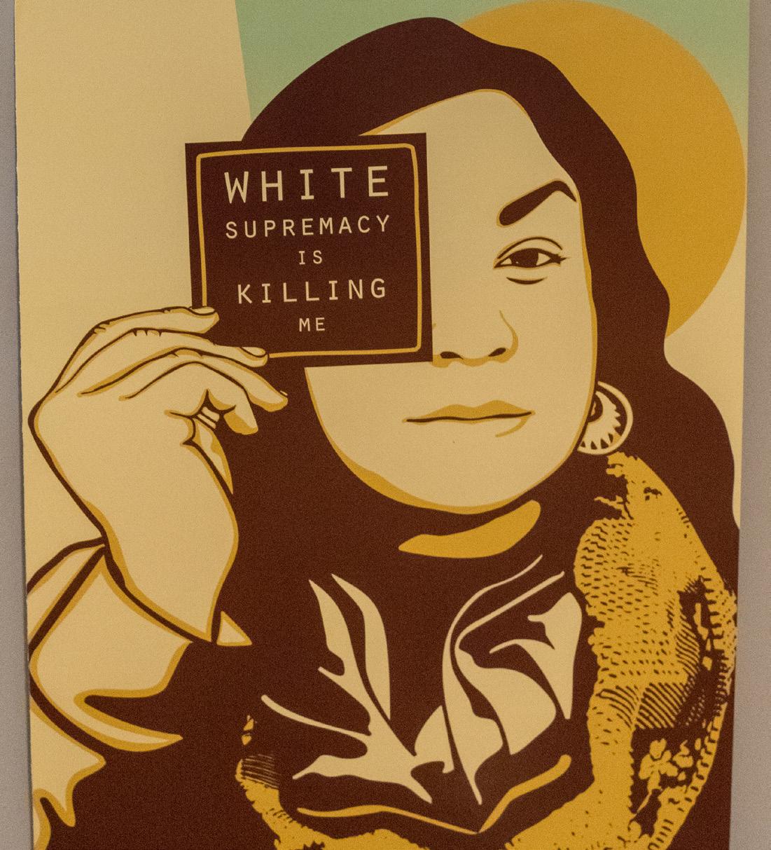 Amplifying Sanctuary Voices, an exhibit at City College Rosenberg Library. A storytelling initiative led by East Bay Sanctuary Covenant (EBSC). Image of exhibit case featuring Defend DACA and NO BAN NO WALL posters. February, 7 2023. Photo by D. Eric Bean/ The Guardsman. Amplifying Sanctuary Voices, an exhibit at City College Rosenberg Library. A storytelling initiative led by East Bay Sanctuary Covenant (EBSC). Image of exhibit case featuring "White Supremacy is Killing Me" poster with art above. February, 7 2023. Photo by D. Eric Bean/The Guardsman.