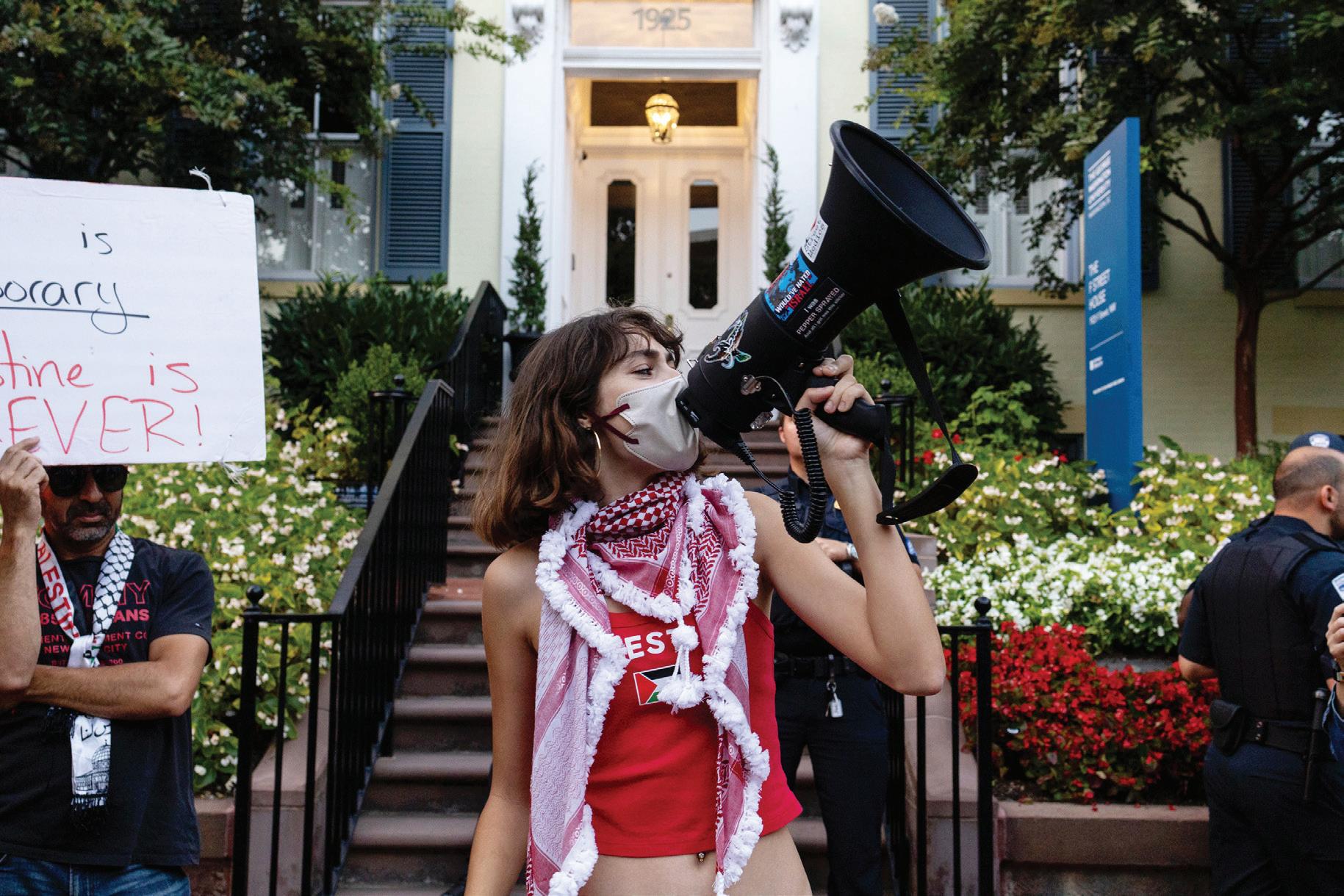 A member of the Student Coalition for Palestinew speaks into a megaphone in front of University President Ellen Granberg’s F Street House.