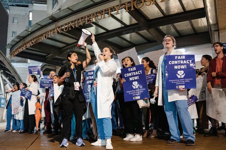 More than 70 people formed a picket line on the sidewalk stretching between GW Hospital and Ross Hall on Wednesday, demanding the University reach a collective bargaining agreement with residents and fellows at the School of Medicine and Health Sciences. As they looped between Ross Hall and the hospital, picketers held white plastic hand-clappers, megaphones and signs reading “We can’t afford our own health care,” “Wages should be raised high” and “Health care heroes can’t afford groceries.” SMHS residents and fellows said GW officials have stalled on reaching agreements related to higher wages and mental health care since the two groups initiated contract negotiations in November 2023. The SMHS residents and fellows overwhelmingly voted to unionize in April 2023 — with 253 voting in favor and 16 against — hoping to improve residents’ salaries and benefits. The rally marks the second time the union has publicly called on GW to accelerate a collective bargaining agreement since starting talks with officials. In April, nearly 300 resident physicians signed a petition