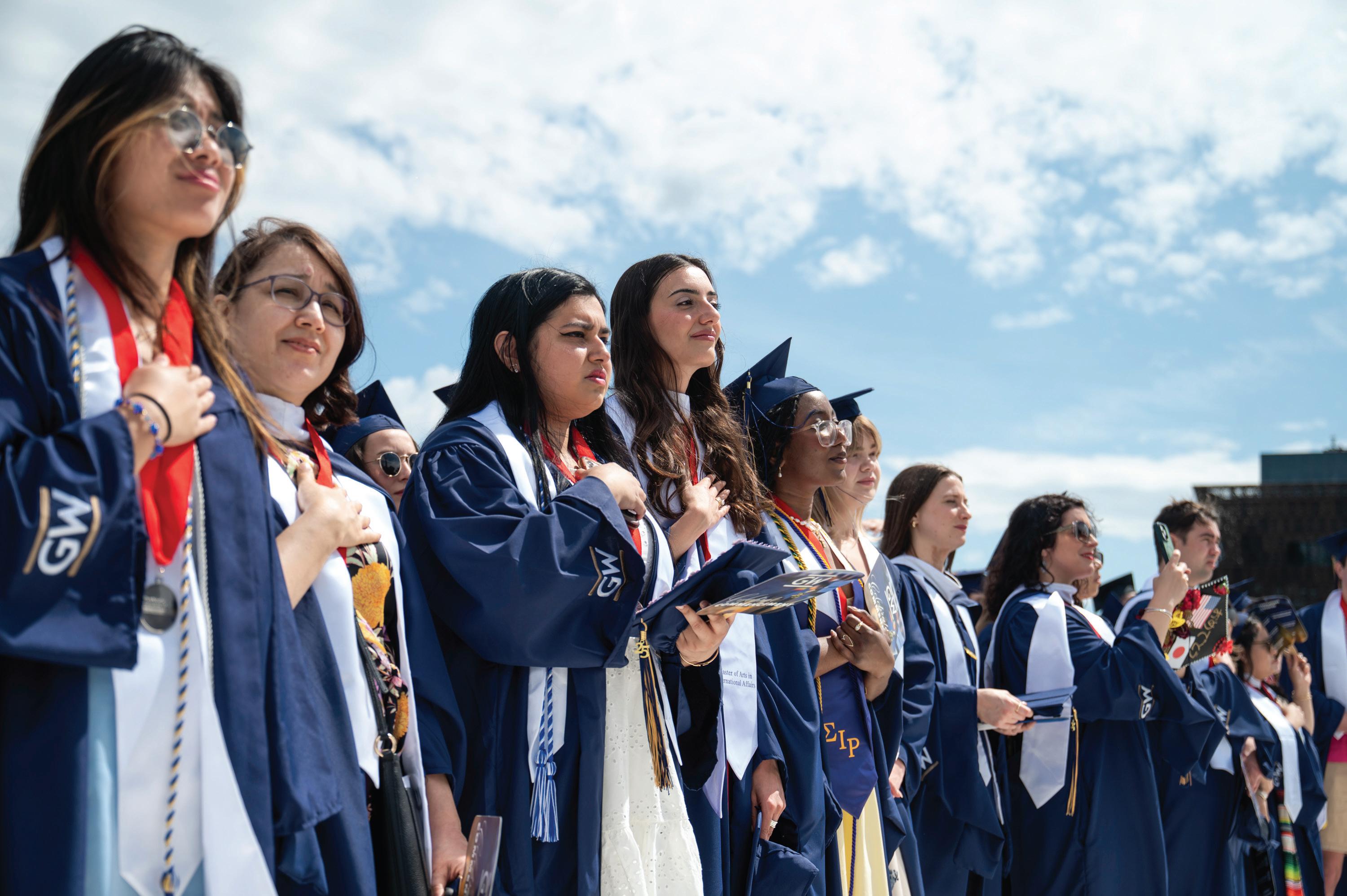 Graduates stand for the national anthem on the National Mall Sunday during University Commencement.