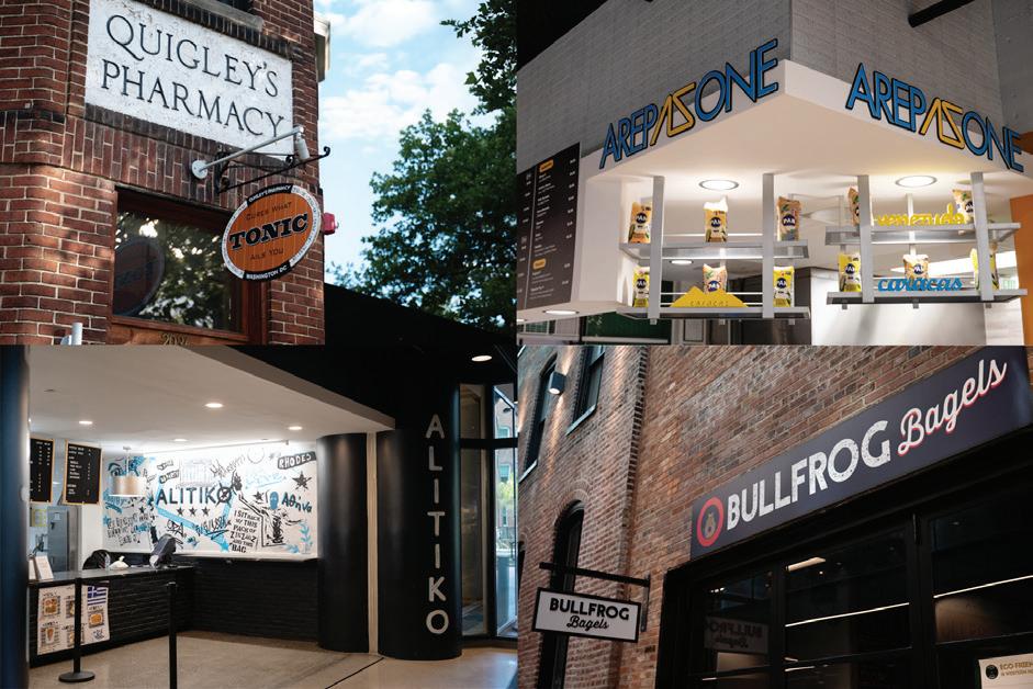 The fronts of Tonic, Arepa Zone, Alitiko and Bullfrog Bagels.