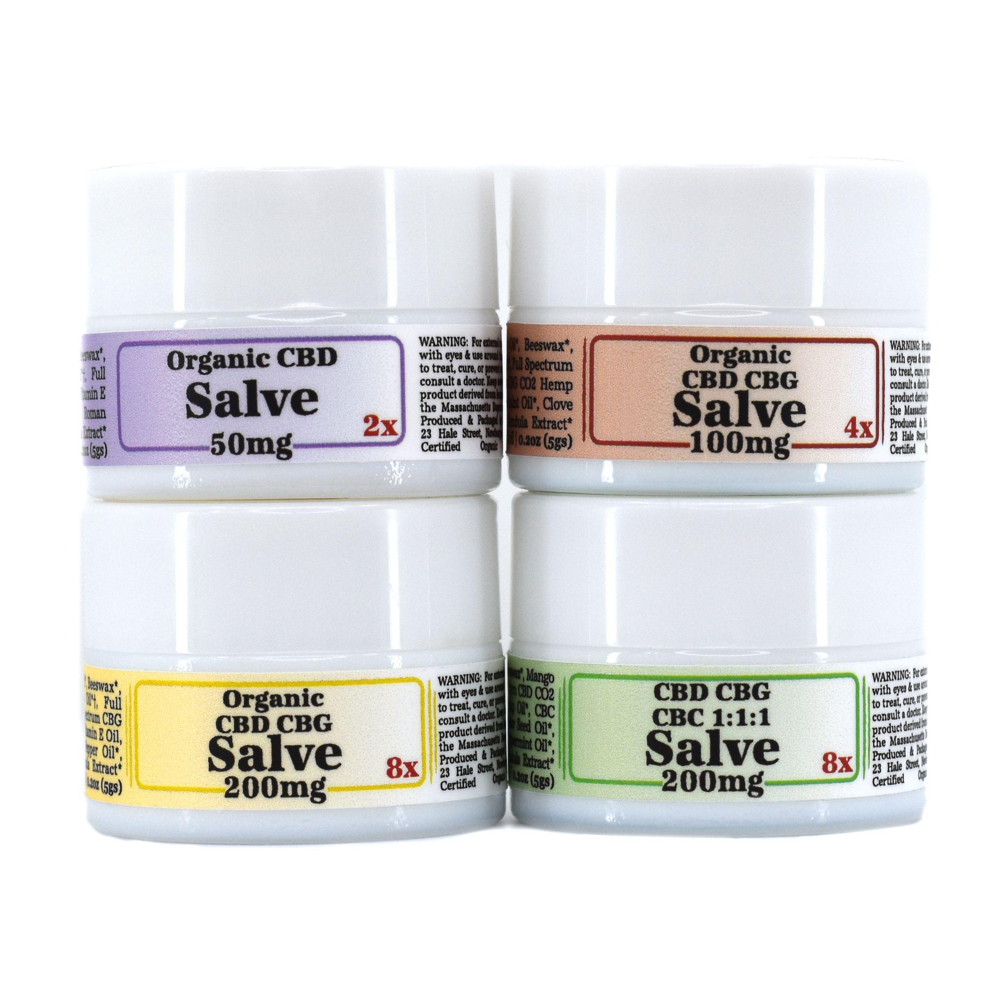 Our Salve Sampler features one of each 0.25 oz salve with a beautiful, sturdy paper tube and a label. Salves come in opal white glass jars.