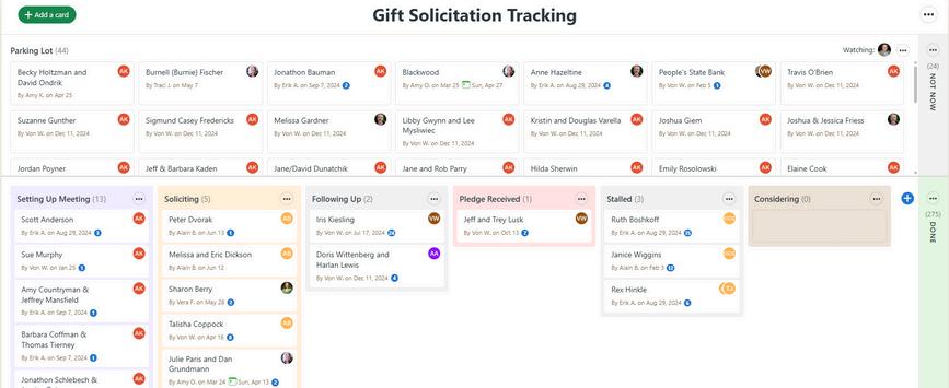 The online platform is set-up with: Kanban board where donors/prospects can be tracked regarding where they are in the solicitation process