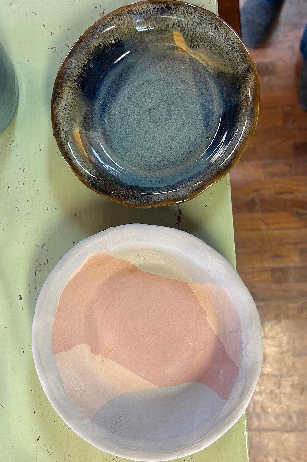 The studio is filled with shelves scattered with bisqueware and greenware waiting to be finished. After the pieces have been glazed, they are fired again at around 2,000 degrees, which melts the minerals inside the glaze and changes its color. The whole process takes about three days.