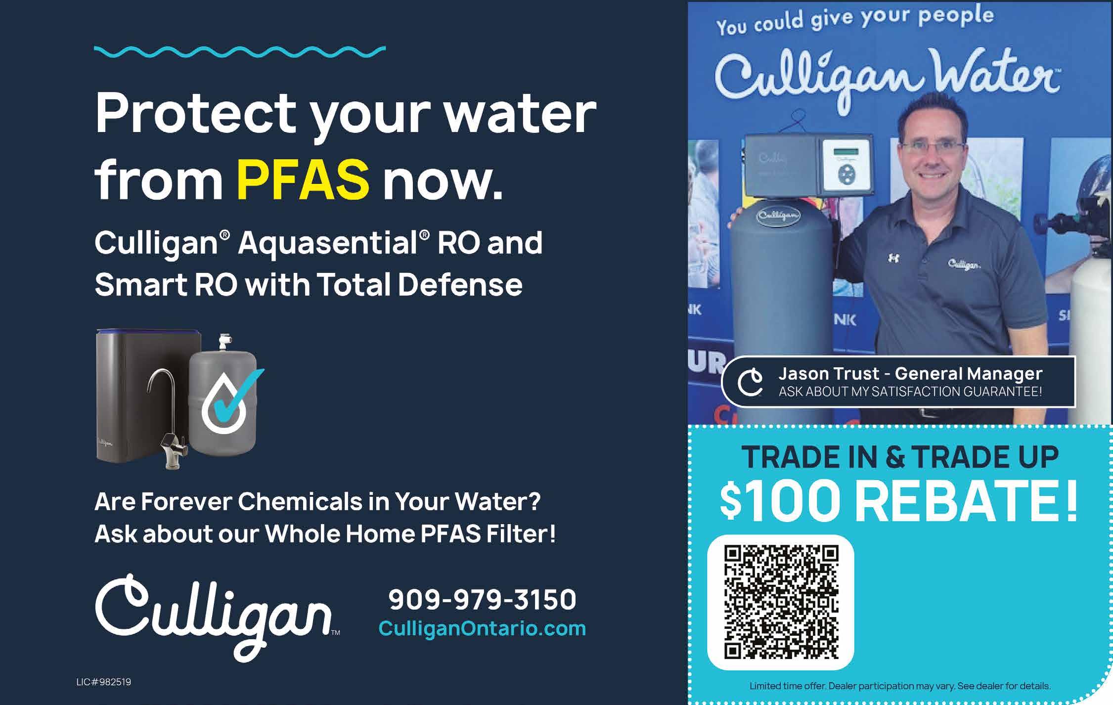 Get a $100 REBATE when you trade in your old drinking water system for a NEW Culligan® Aquasential® Drinking Water System.