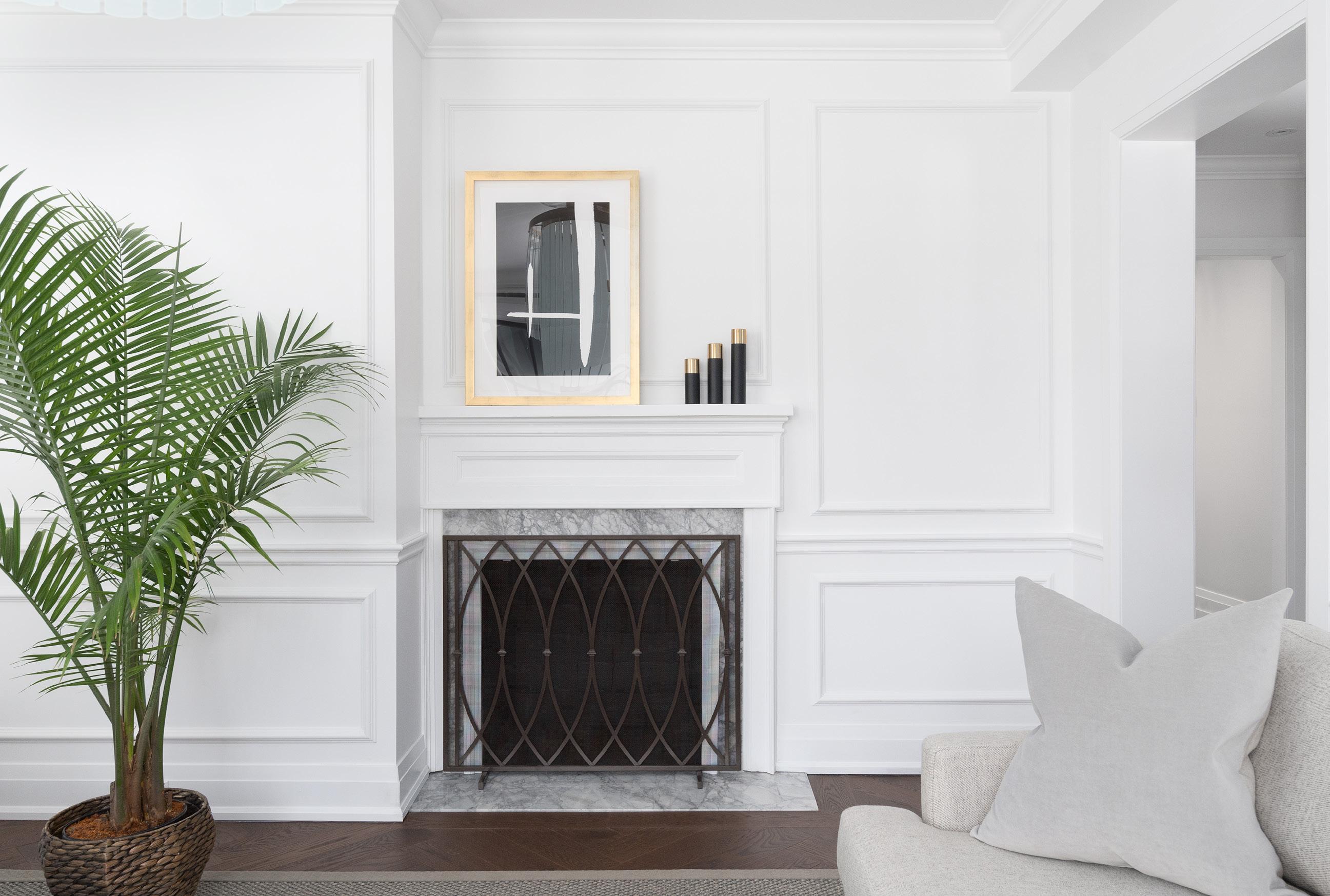 Aside from the fireplace itself, comes everything that surrounds it. In my designs I like to bring in custom builtin shelving surrounding a fireplace as a way to frame this feature, or create a streamlined display with a simple but bold piece of framed artwork, suspended above or placed on the mantel.