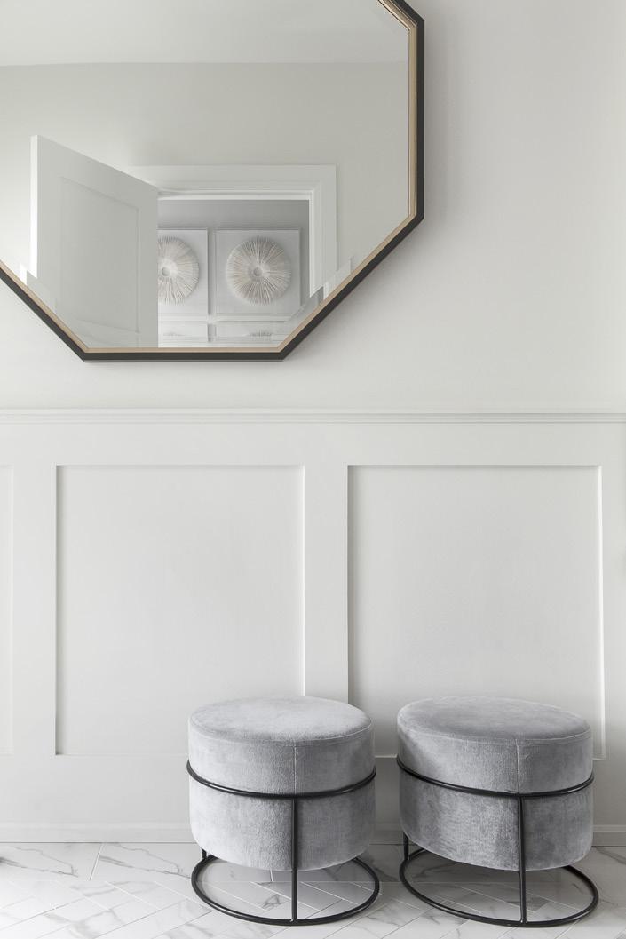 I LOVE FOYERS,” ANA ADMITTED. “FOR THIS PROJECT, WE DID A HALF WALL OF WALL PANELLING WITH A HERRINGBONE FLOOR DESIGN, AN OVERSIZED GEOMETRIC MIRROR AND A GROUPING OF SEATING. I WAS REALLY HAPPY WITH THE WAY IT TURNED OUT.