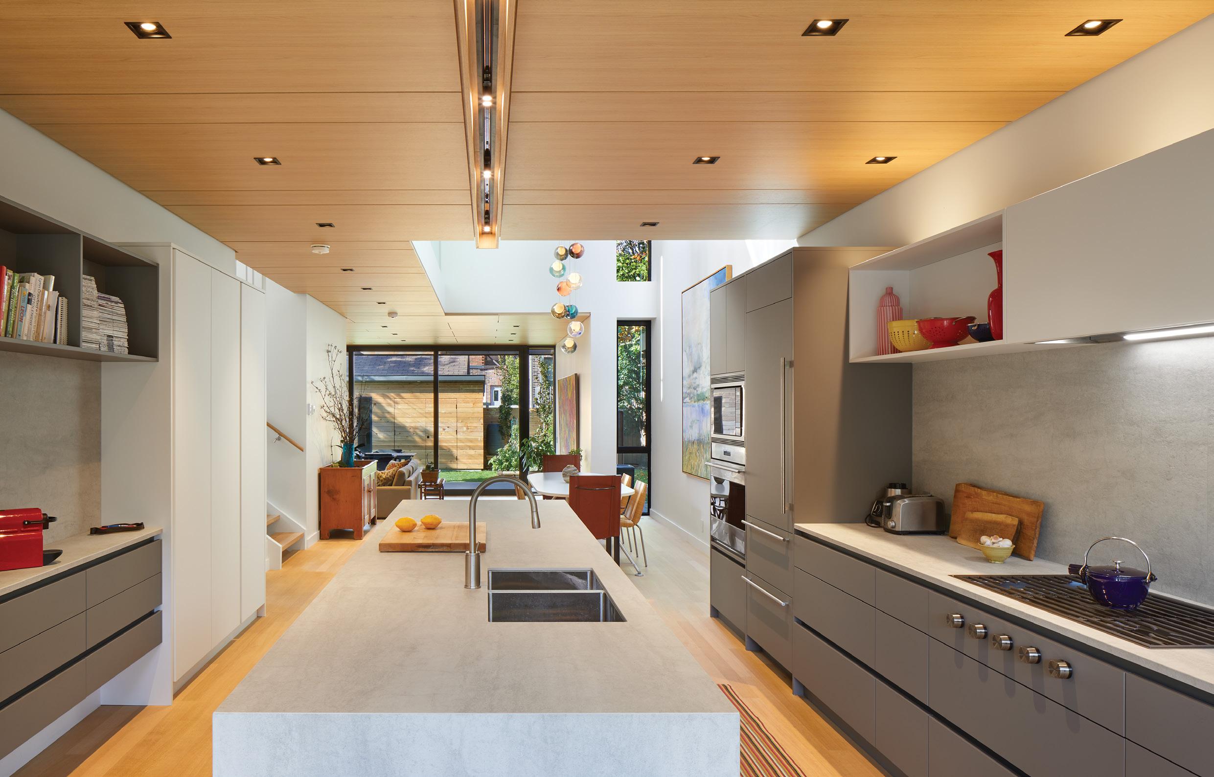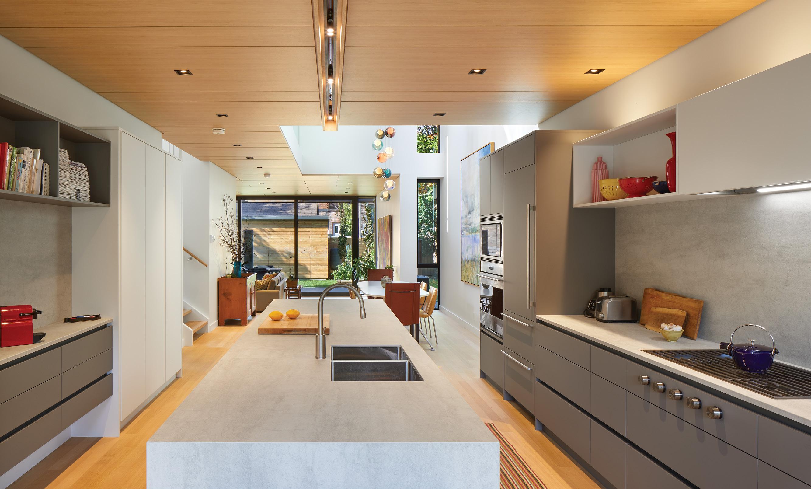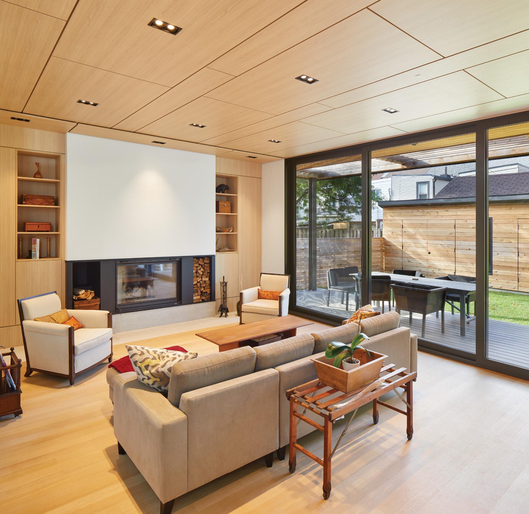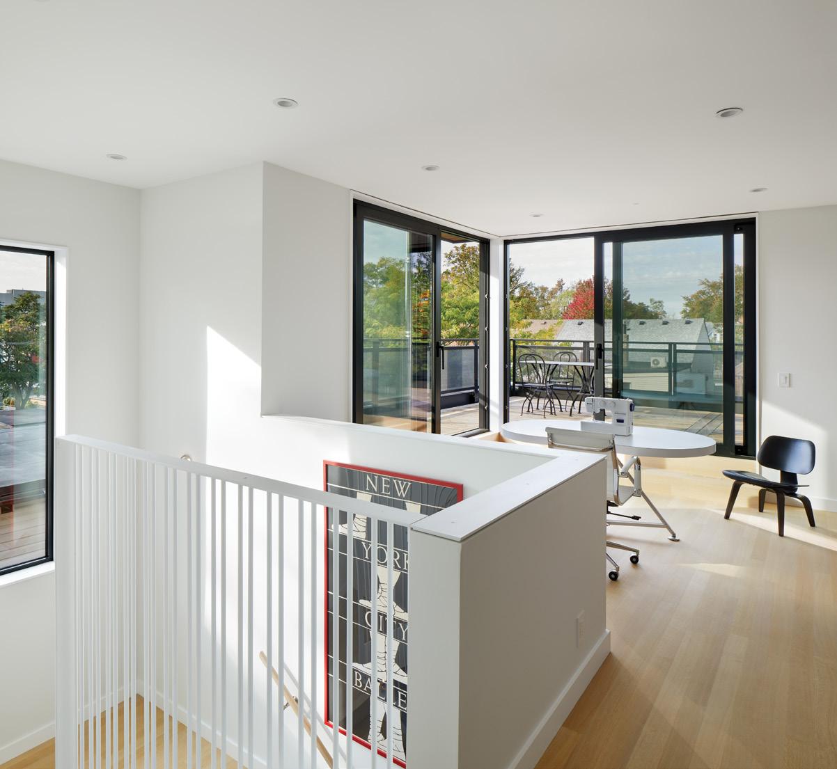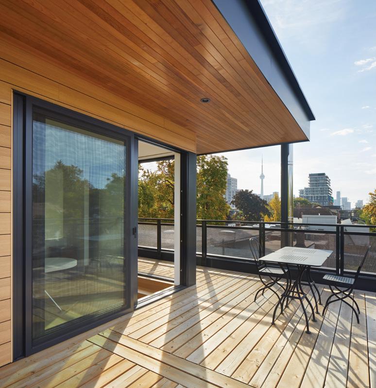 to improve energy efficiency. The ground floor features in-floor radiant heating, which provides significant energy savings during the winter months. Flat roofs were built with continuous insulation on top of the deck, rather than with insulation in-between joists, enabling a superior level of insulation and eliminating thermal bridging. The front driveway features a minimal footprint (2 parallel strips), built with permeable pavers to maximize natural water absorption. Both houses are organized around a central skylit atrium with abundant natural light, and have custom canopies above the terraces, which maximize passive heat gains in the winter, while also providing shade in the summer.