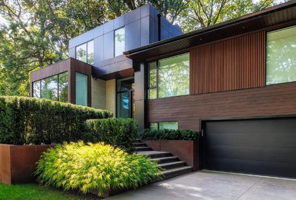 facing the street. The solution for both houses was to clad the surfaces of the ground floor façade—the garage door, walls, front door, and the soffit of the porch—with the same material. The team sourced a panel product called Trespa, a high-pressure compact laminate panel based on thermosetting resins, homogeneously reinforced with wood-based fibers with a printed surface layer that looks like oak and is virtually indistinguishable from real wood, except that it is maintenance free.