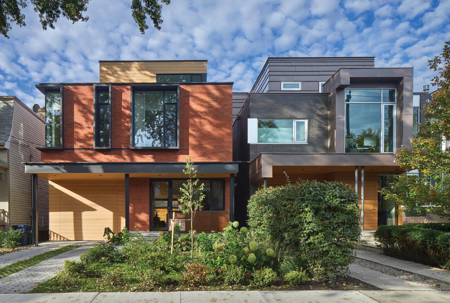 The 3,000 square foot residences are located on a unique street in the heart of downtown Toronto, which is a heritage district with mostly historically-designated houses. Here, approval to build is overseen by Heritage Preservation Services, which generally mandates a traditional style. However, the existing houses on both lots were 1960’s bungalows with no architectural merit.
